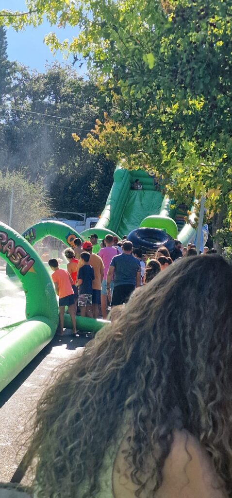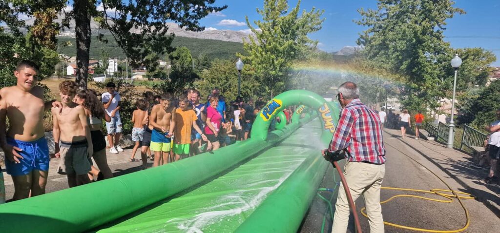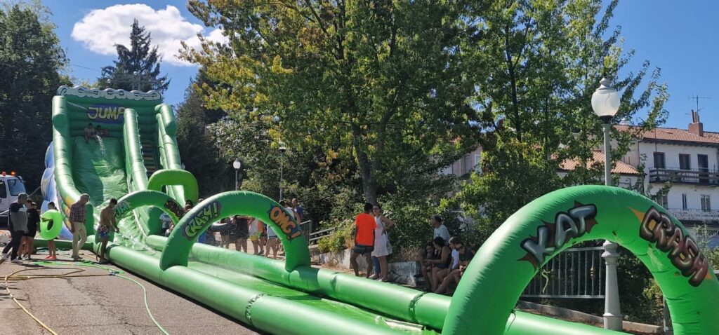 Todo ello ante la ansiosa mirada de los más pequeños, pero “también hay gente mayor, no te creas”, que habían decidido luchar contra el sofocante calor de la cuarta ola del verano mojándose y tomando velocidad por los 125 metros de tobogán instalado en la avenida de San Isidro. Una ubicación perfecta, gracias a la inclinación del terreno en la misma. “Se ha echado más agua, y también más jabón. A los pequeños, les cuesta coger velocidad, pero los mayores, sí que van rápido”. Al final del recorrido y casi de la calle, les espera una piscina para frenar su refrescante avance.