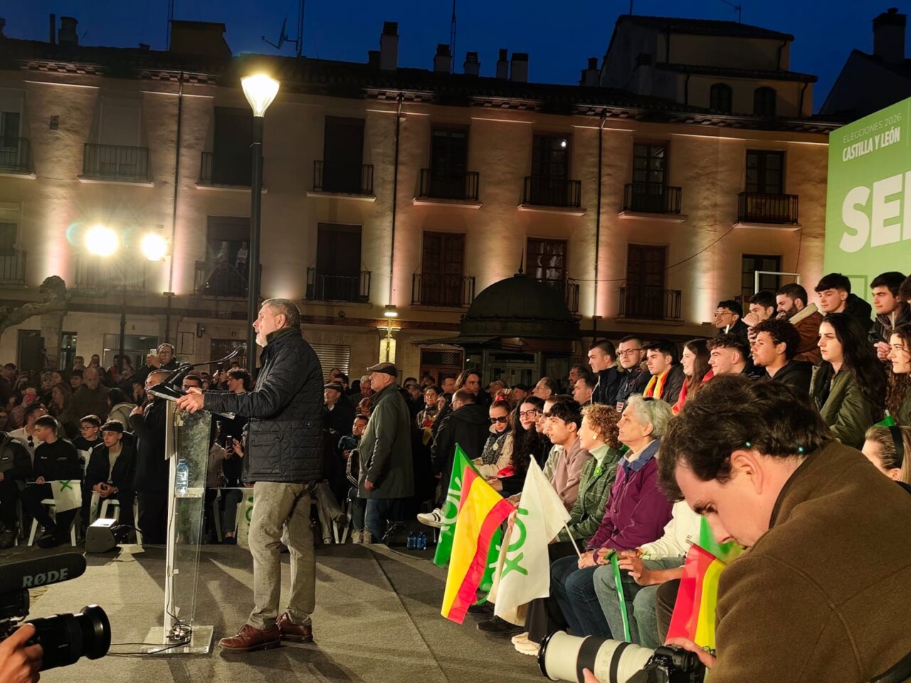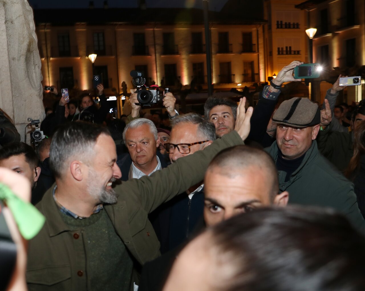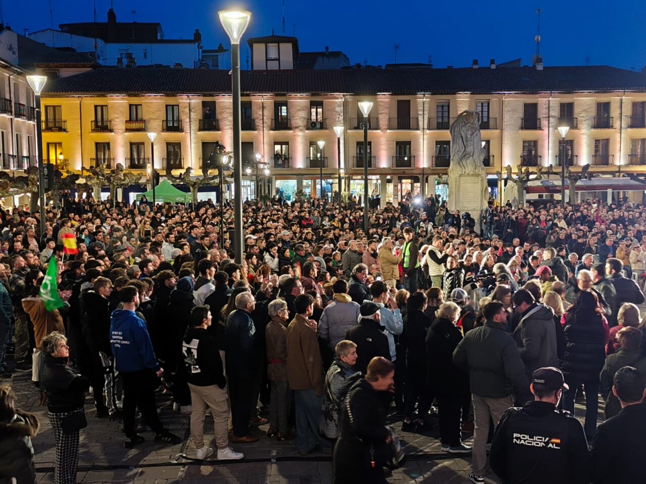 VOX y Santiago Abascal llenaron esta tarde-noche buena parte de la Plaza Mayor. No entera, eso Palencia lo reserva para otro tipo de eventos, pero es de destacar la movilización y el fervor, casi religioso, de los correligionarios que recibieron al presidente de VOX en su participación en un acto de campaña de cara a las elecciones autonómicas de Castilla y León.