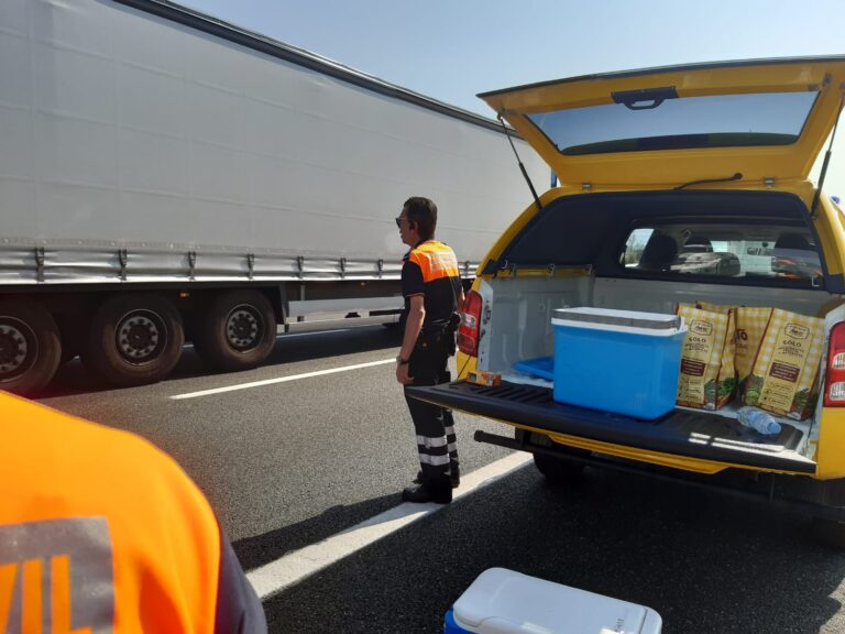 El accidente provocó largas retenciones en la vía y Protección Civil y Cruz Roja se movilizaron para dar avituallamiento a...