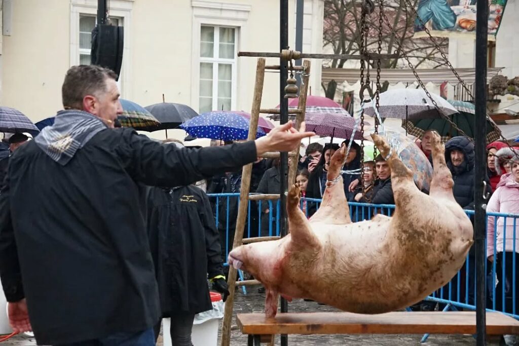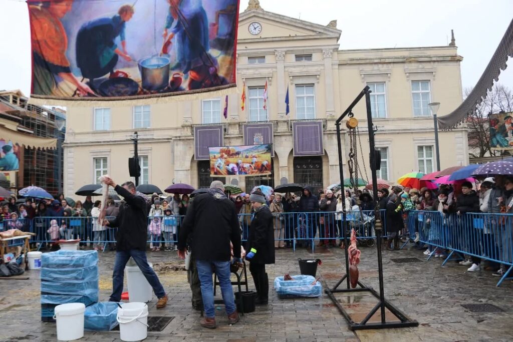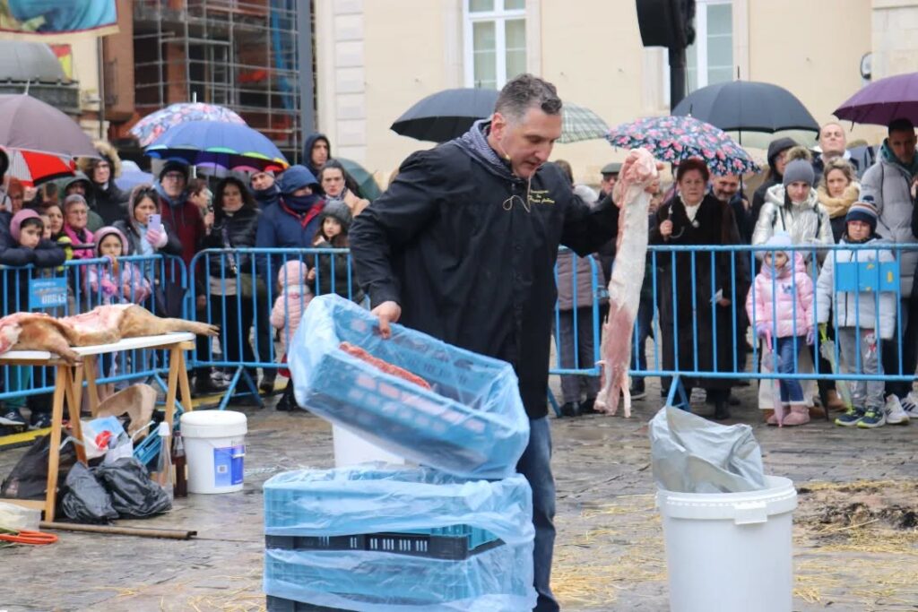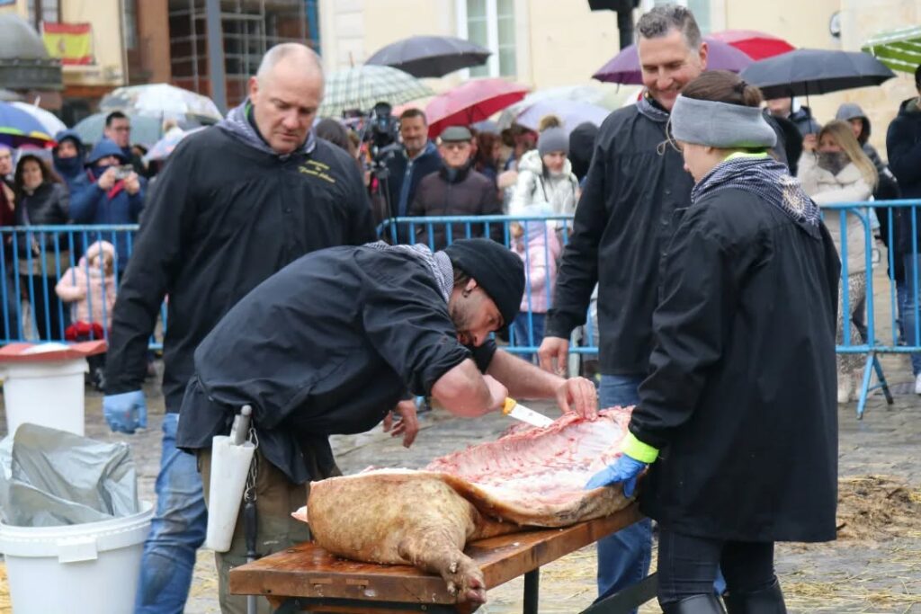 La plaza Mayor de la ciudad fue el escenario de la demostración del despiece del cerdo