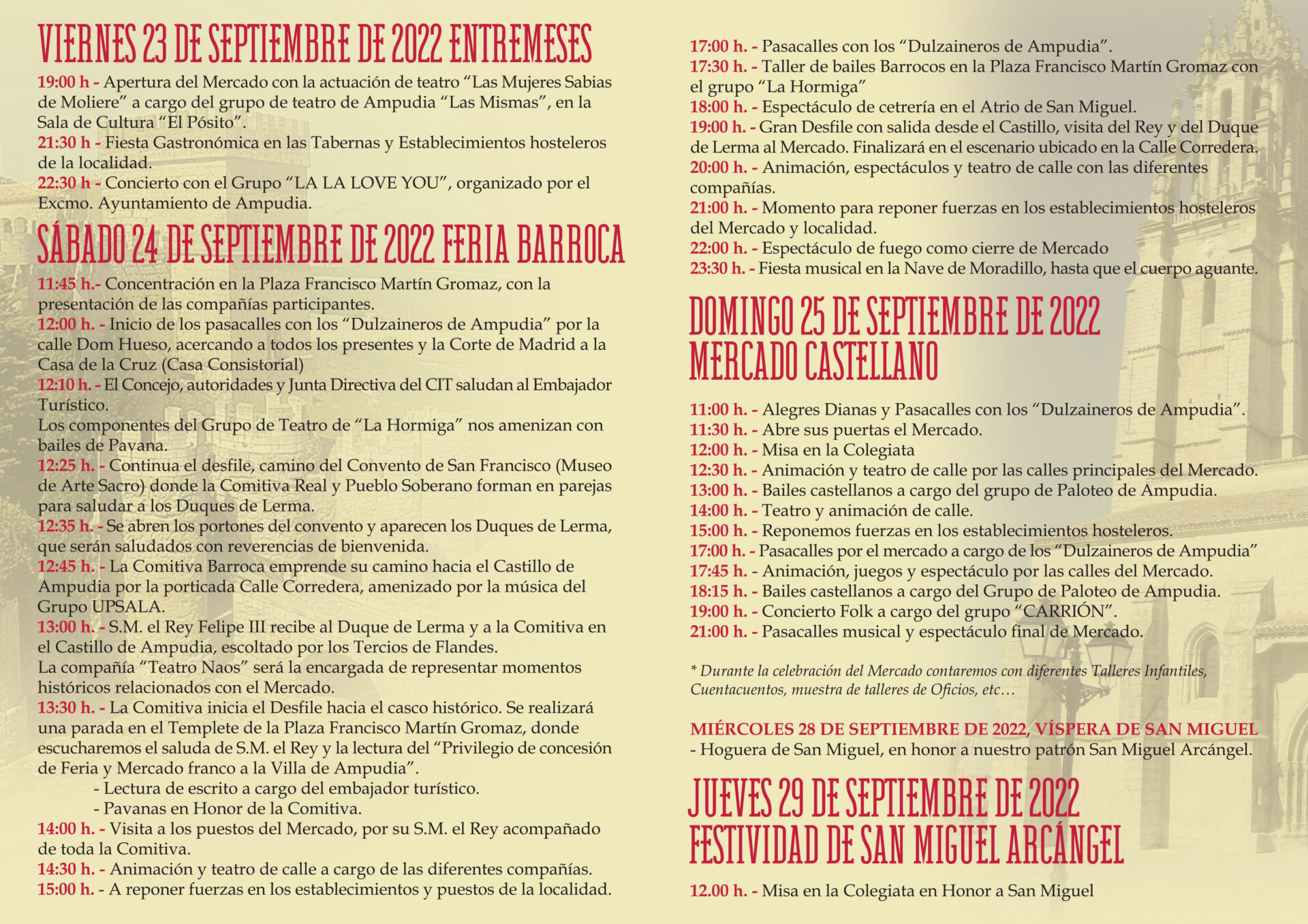 El sábado, 24 de septiembre, será el día en el que Ampudia se engalane con trajes de época de tal forma que la Comitiva Real y el Pueblo Soberano saludarán a los Duques de Lerma. A las 13 horas el Rey Felipe III recibirá al Duque de Lerma y a la Comitiva en el Castillo de Ampudia, escoltado por los Tercios de Flandes. Hasta las 15 horas habrá desfiles, bailes, entretenimiento para todos los visitantes en las calles principales…