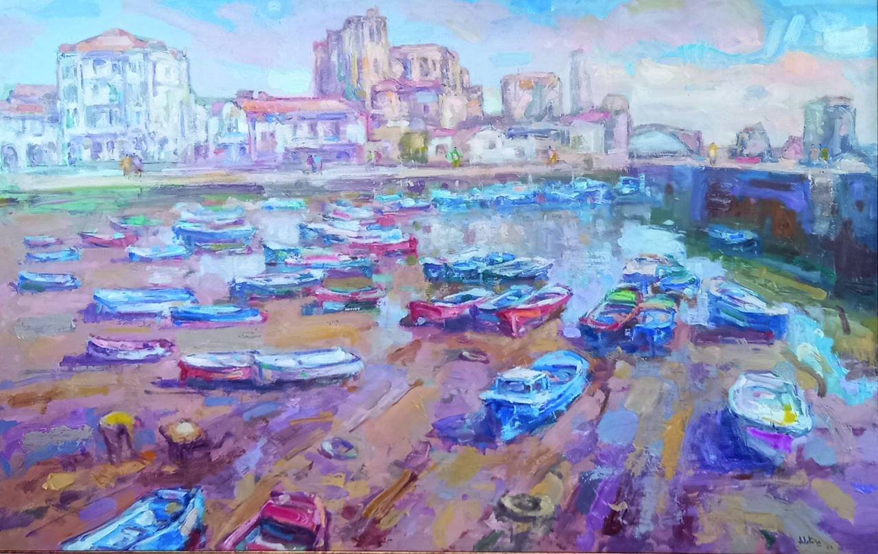 Pero en su obra late también con fuerza la otra gran geografía de su corazón, la ría de Bilbao, los puertos del norte, los barcos amarrados, las faenas de los pescadores, el esfuerzo humilde y duro de quienes viven de la mar.