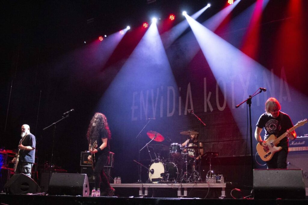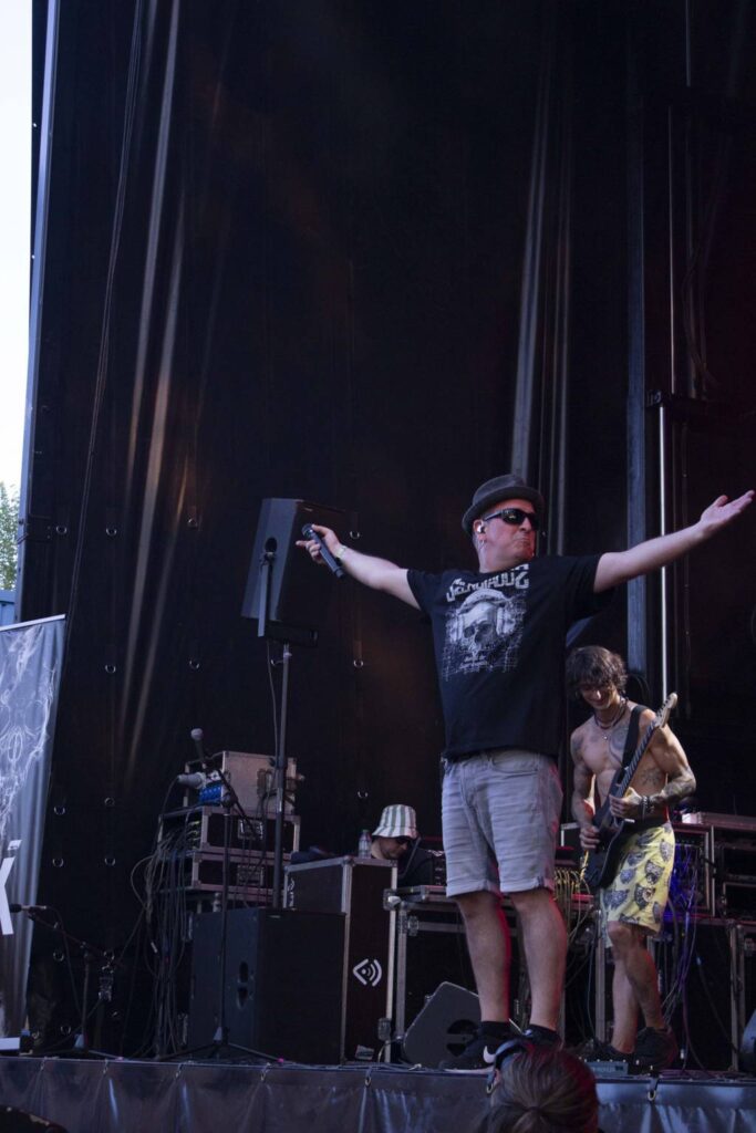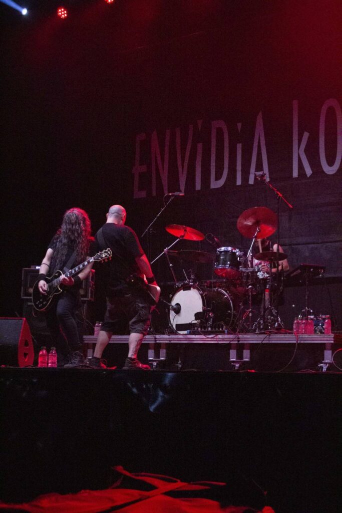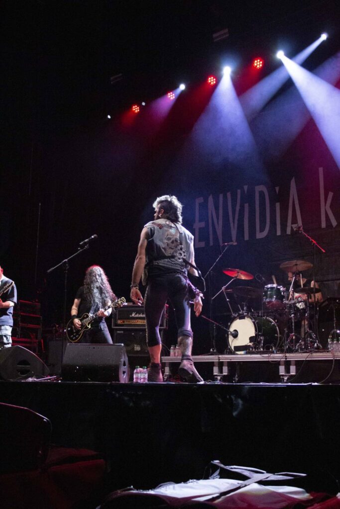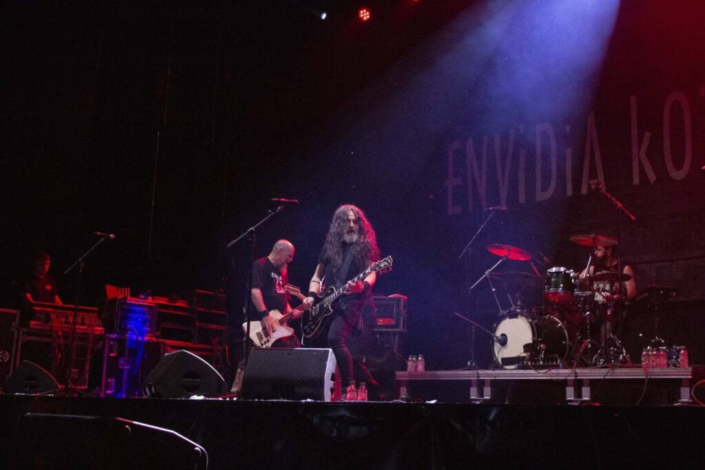 El espacio entre el público y la valla que protege el escenario se ha ido reduciendo paulatinamente. Cuando llega el turno de Envidia Kotxina, ya ha desaparecido. La gente está en la zona donde los bajos hacen que te retumbe el pecho, y el suelo bajo tus pies. El fervor que envuelve al público, causa un arrebato en el que un espontáneo con agilidad felina salta la valla y se sube al escenario. Allí es recibido con caras de sorpresa, pero los músicos no paran de tocar.