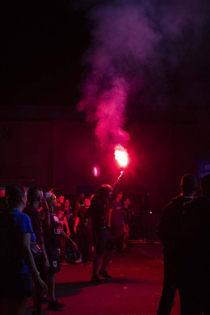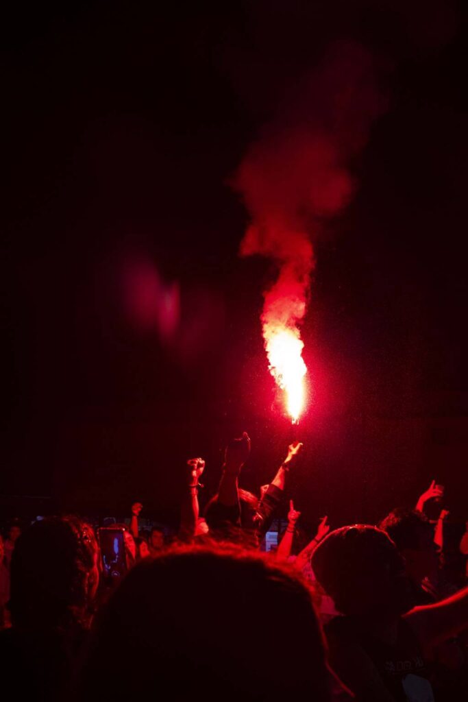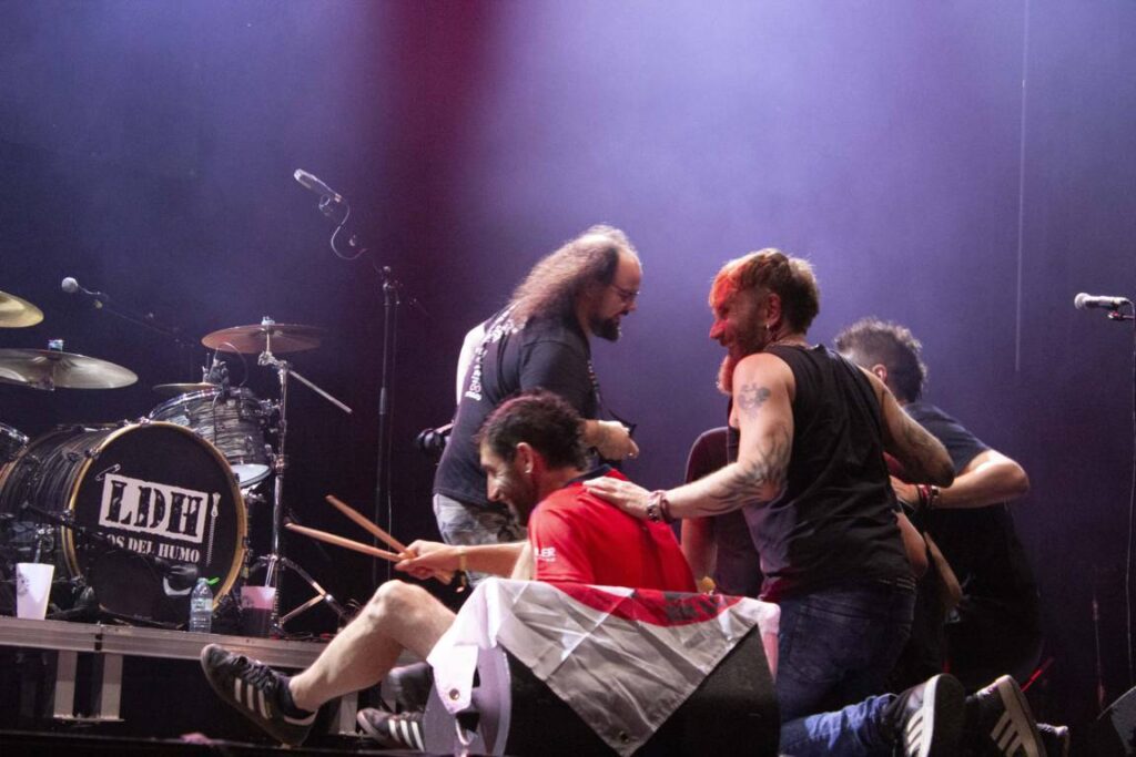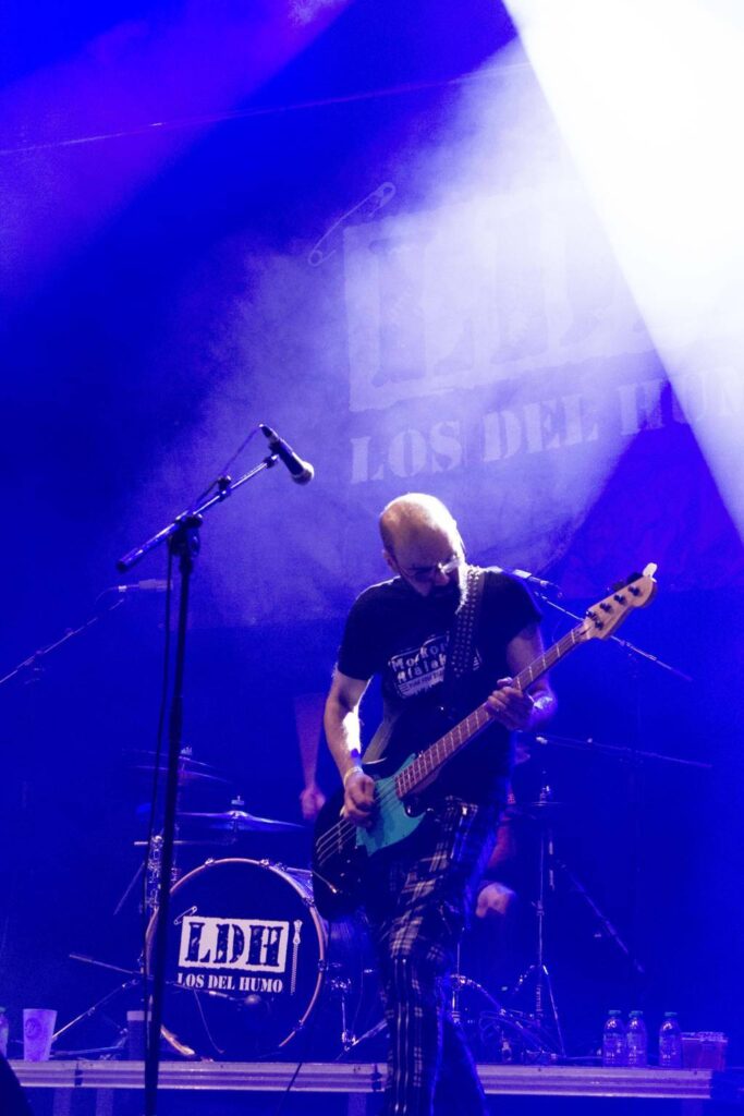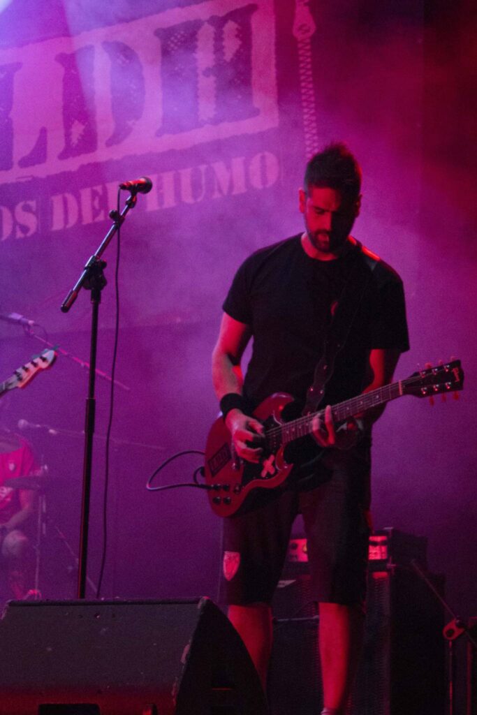 La misión de cerrar la noche recae sobre Los de Humo. La luz de una bengala tiñe de rojo la pista. Por fortuna, o porque el concierto comenzaba a las 2:30 de la mañana, se había disuelto bastante la aglomeración de personas previa. En este caso Chus, solo se dedica a cantar, lo cual llena el escenario de dinamismo. Afirman que vienen de un pueblo “tan pequeño como este, en las montañas de Burgos, donde se hace el Tresparock” (El Tresparock es un festival también solidario y autogestionado que se celebra en Trespaderne, Burgos. La edición de este año tendrá lugar del 17 al 20 de julio).