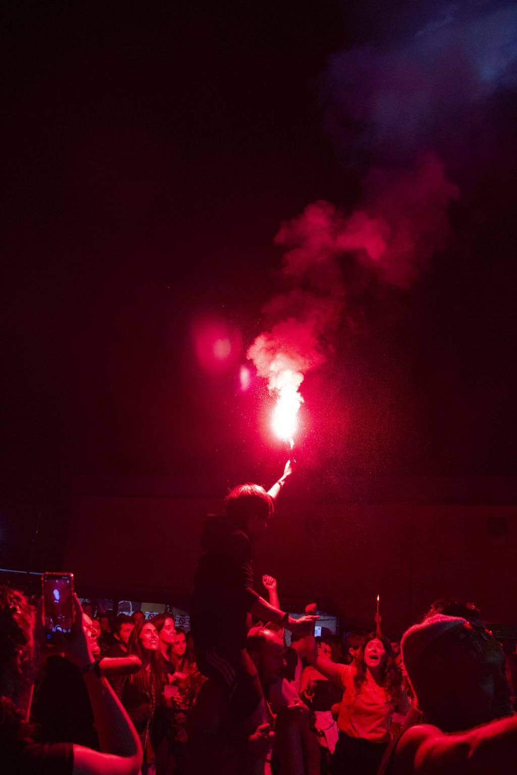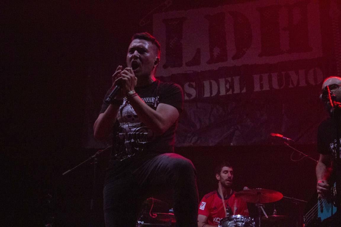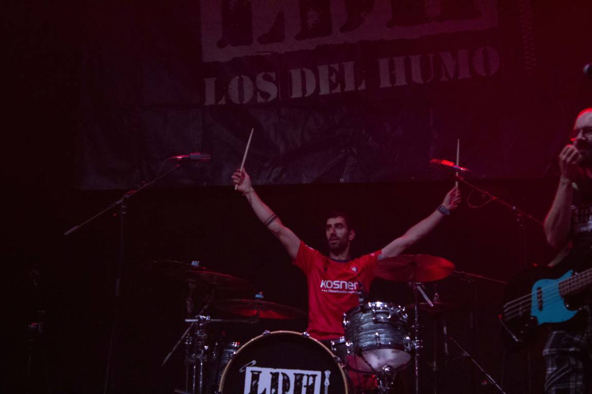 La misión de cerrar la noche recae sobre Los de Humo. La luz de una bengala tiñe de rojo la pista. Por fortuna, o porque el concierto comenzaba a las 2:30 de la mañana, se había disuelto bastante la aglomeración de personas previa. En este caso Chus, solo se dedica a cantar, lo cual llena el escenario de dinamismo. Afirman que vienen de un pueblo “tan pequeño como este, en las montañas de Burgos, donde se hace el Tresparock” (El Tresparock es un festival también solidario y autogestionado que se celebra en Trespaderne, Burgos. La edición de este año tendrá lugar del 17 al 20 de julio).