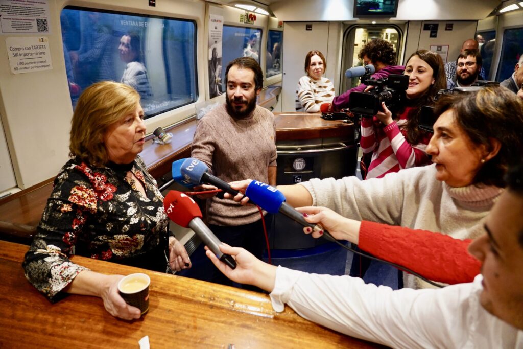 En la vía once de la estación leonesa, periodistas de ambos lados del Negrón se agolpaban a la espera de un tren al que subieron unas decenas de viajeros y que se sumaron a los que ya habían entrado en la estación de Madrid-Chamartín, Valladolid y Palencia.