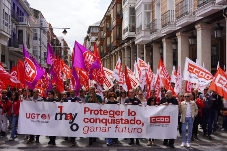 Cientos de personas se han sumado esta mañana a la manifestación organizada por CCOO y UGT en Palencia que recorrió...
