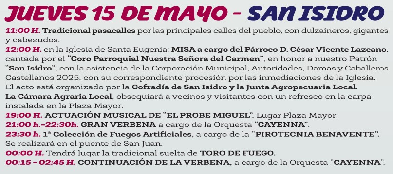 El día grande de las fiestas de San Isidro, el día 15 de mayo, jueves, comenzará con un pasacalles, que encaminará al pueblo a Santa Eugenia, donde se celebrará mis cantada con procesión por las calles del pueblo. Al finalizar, la Cámara Agraria Local agasajará a los vecinos y visitantes con un refresco en la carpa de la plaza mayor.