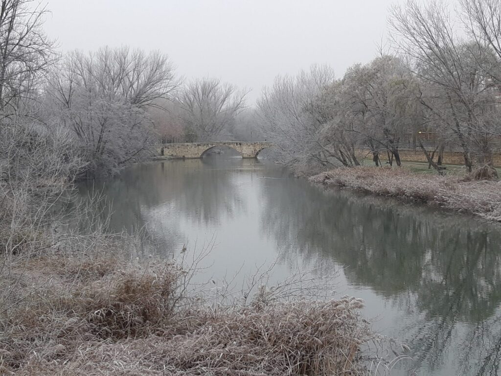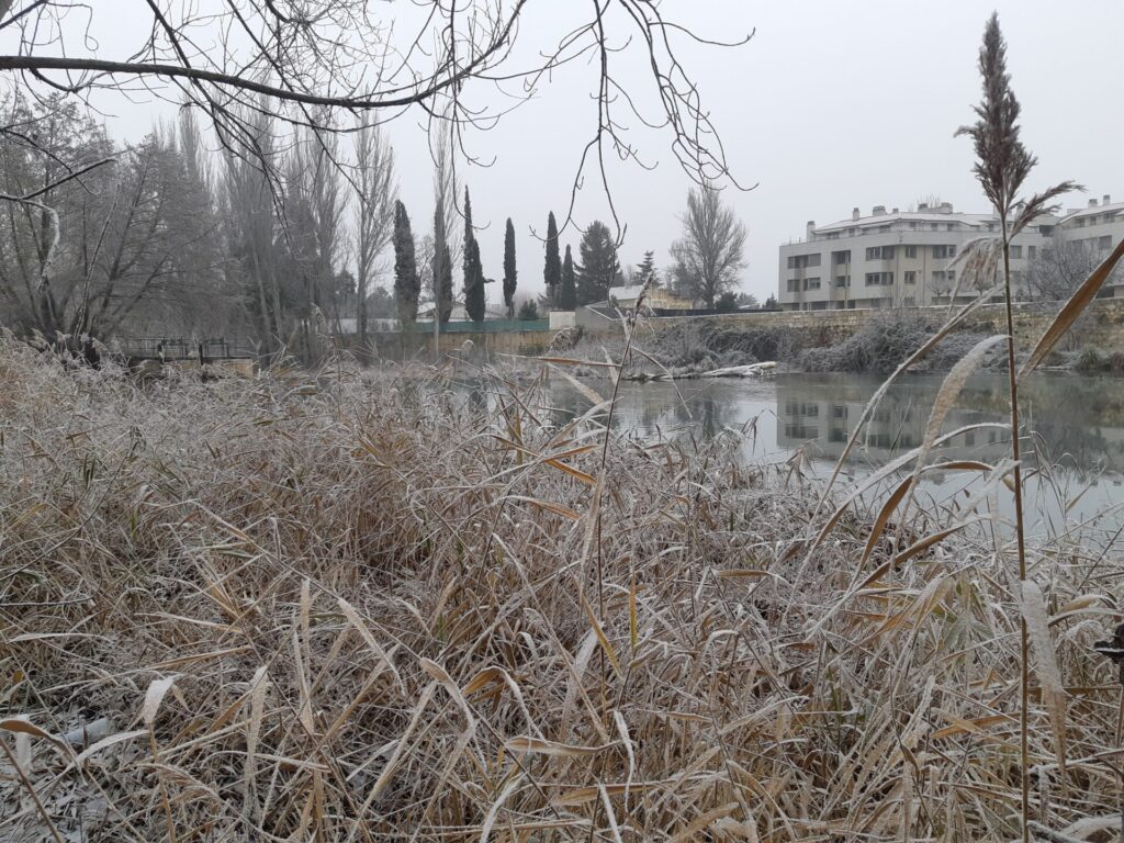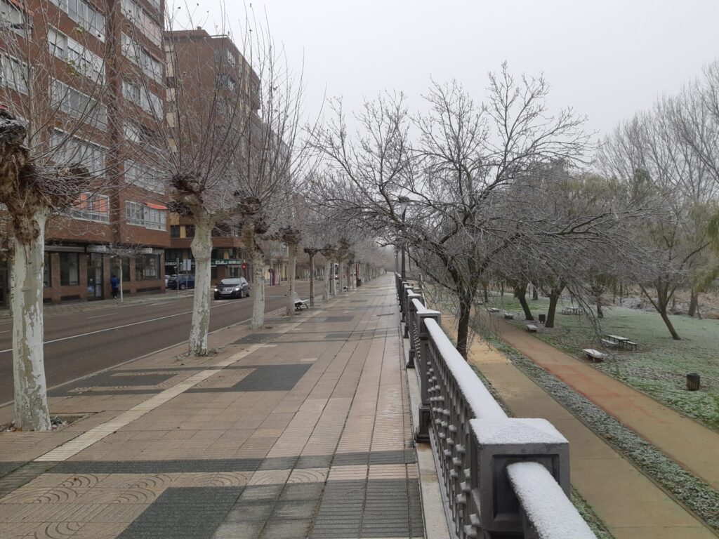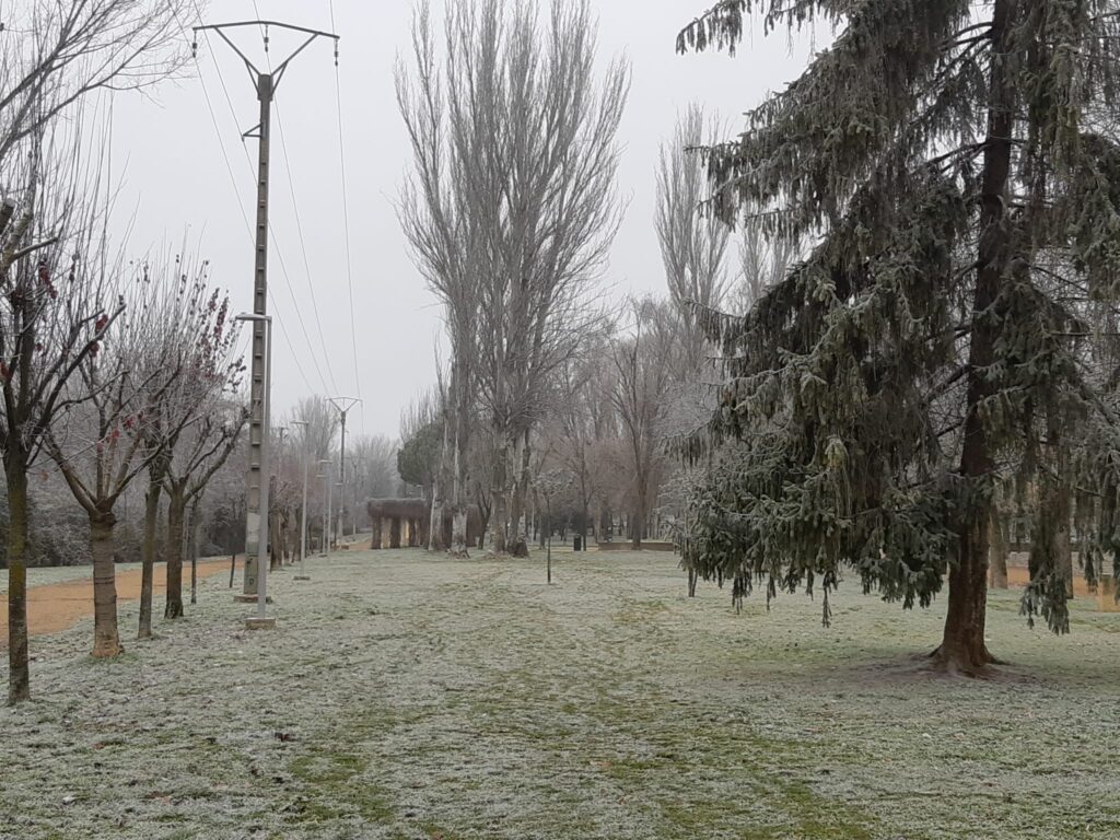Árboles espolvoreados con polvo blanco, nieblecilla alrededor, pequeños depósitos de hielo en polvo… todo un espectáculo para la vista observar Palencia en tonos blanquecinos.