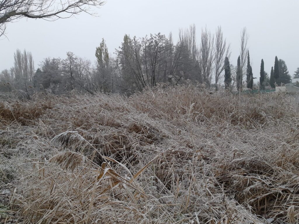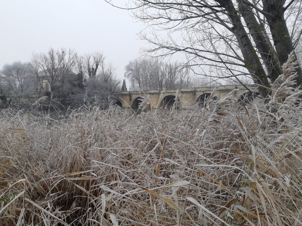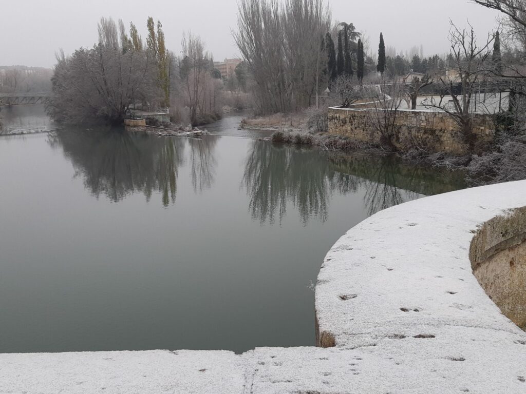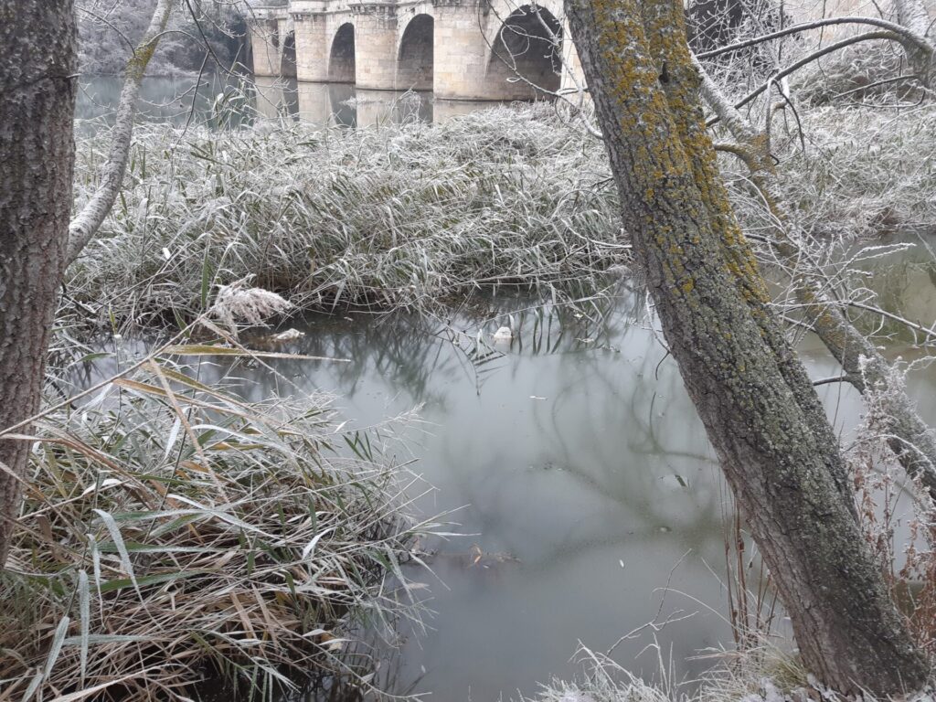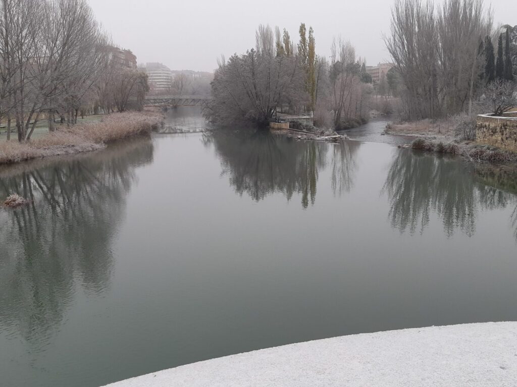 Árboles espolvoreados con polvo blanco, nieblecilla alrededor, pequeños depósitos de hielo en polvo… todo un espectáculo para la vista observar Palencia en tonos blanquecinos.