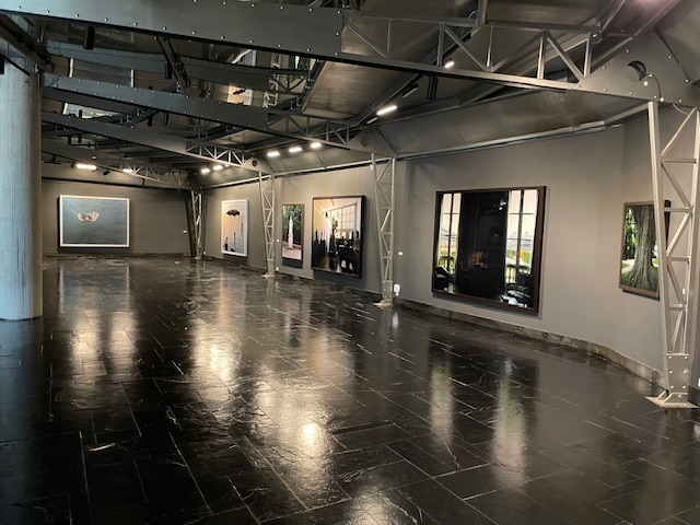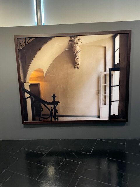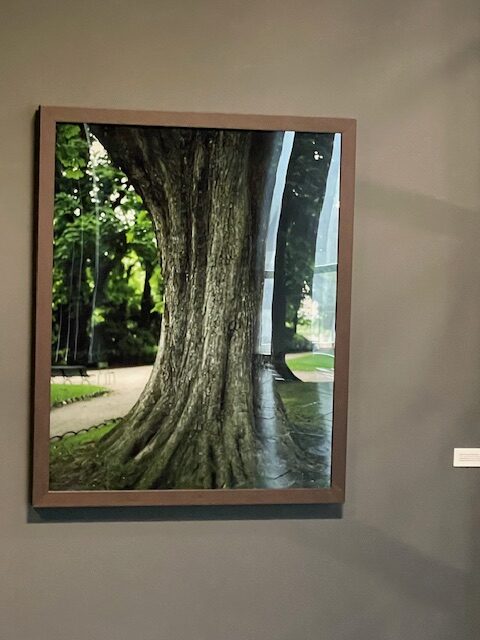 La primera obra de la muestra es un excelente interior, el fragmento de una escalera, en el que la luz se cruza desde dos puntos opuestos, derecha e izquierda, con líneas curvas y rectas, un espacio central plano y una ménsula clásica en forma de mujer que irrumpe en el espacio central. Otra composición potente es la textura que se observa de la corteza de un gran árbol, que contrasta con el verde difuminado del bosque, o la escultura de una reina con un grupo de sillas a la izquierda y el vacío a la derecha, escenarios de una presencia femenina ausente físicamente, pero presente en la atmósfera.