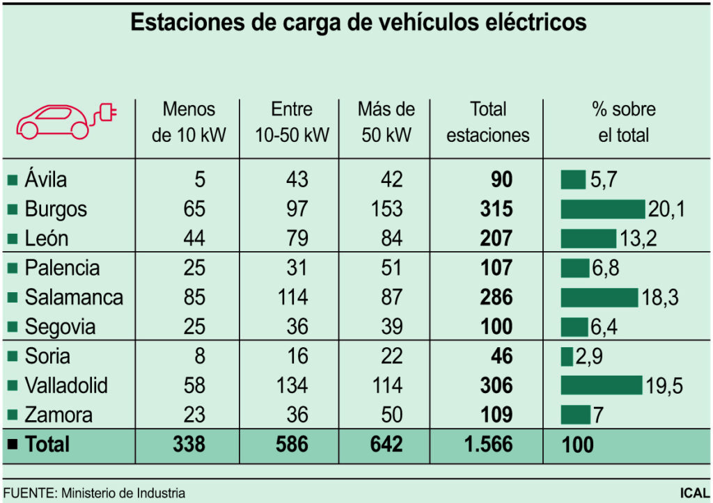 Por cantidad de puntos de recarga y por provincia, destacan Burgos, con 315 del total, lo que equivale al 20,1 por ciento, una quinta parte; seguida de Valladolid, con 306 y el 19,5 por ciento, Salamanca, con 286 estaciones y el 18,3 por ciento, y León, con 207 y el 13,2 por ciento. Entre las cuatro suman siete de cada diez de todas las que se contabilizan en la Comunidad.