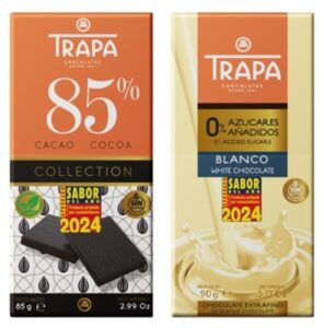 Pensando en todos los consumidores, Chocolates Trapa ofrece una amplia gama de bombones, turrones y tabletas de chocolate sin azúcar. Ha conseguido el sello Sabor del Año 2024 su tableta de chocolate blanco extrafino, un clásico de textura fundente y mucho sabor que se presenta libre de azúcares añadidos (90 g, PVP 1,65 euros).