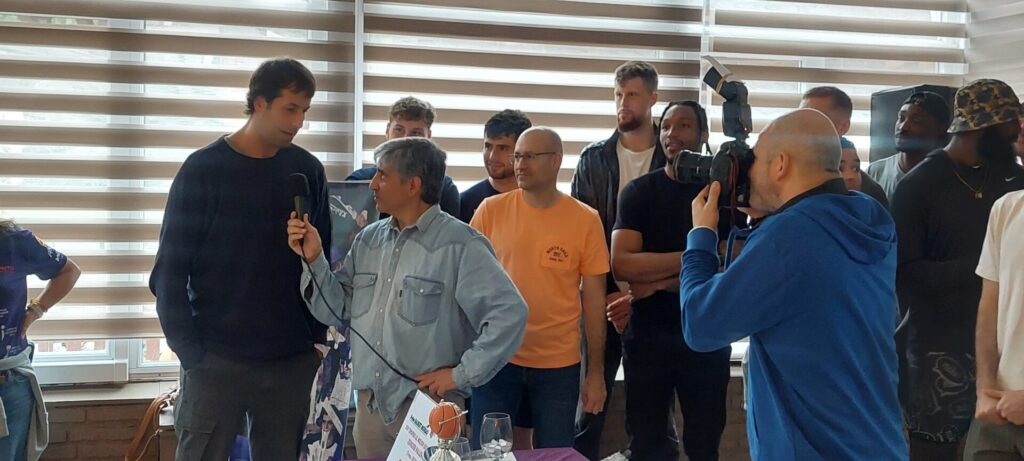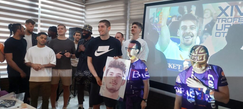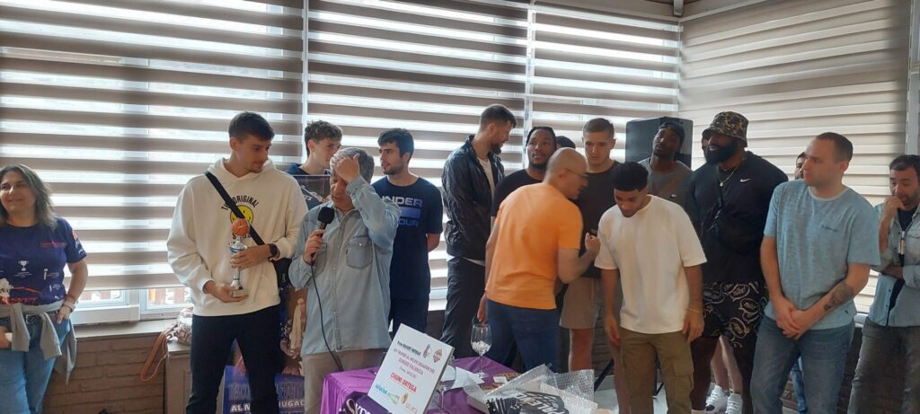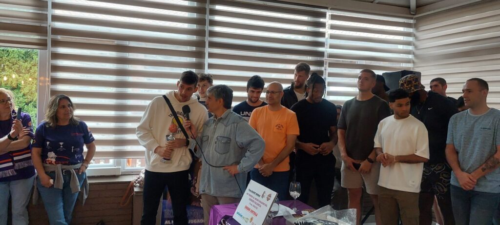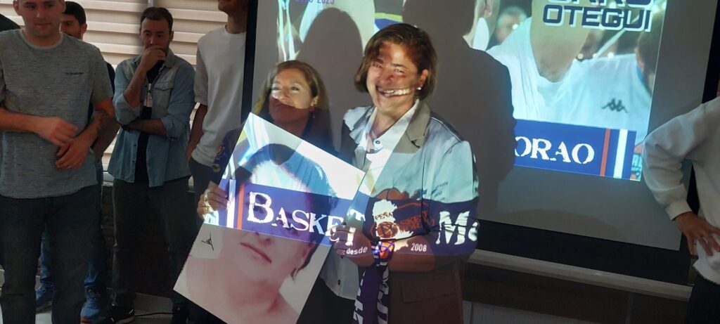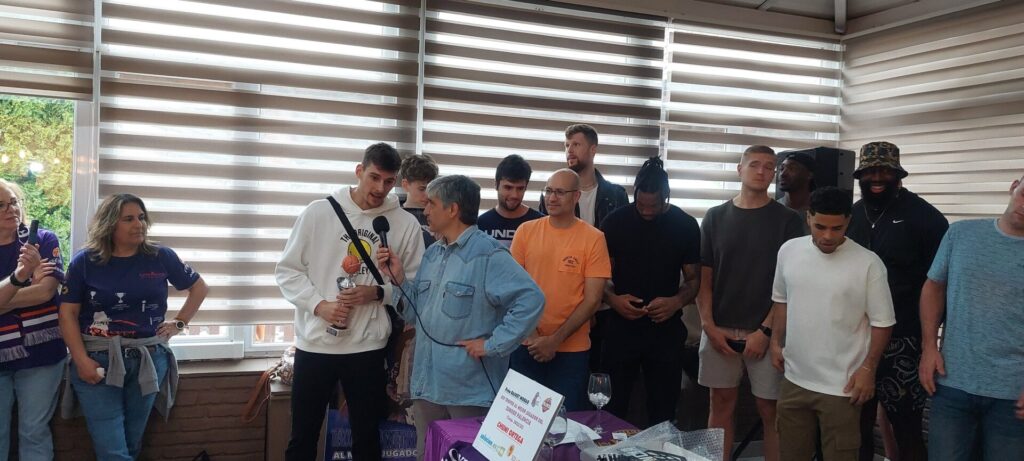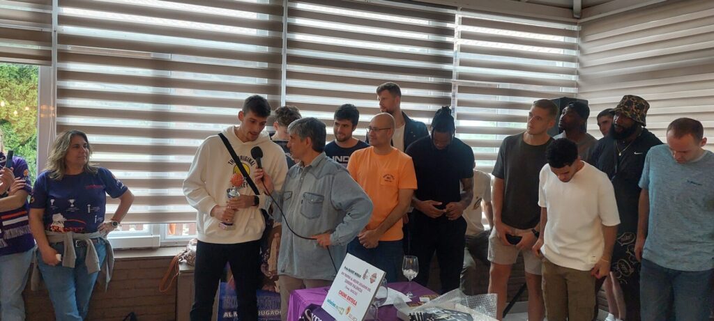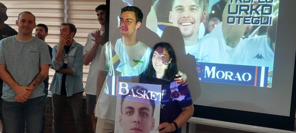 Y por fin llegó el momento de la entrega del Premio Urko Otegui 2022-23 al Mejor Jugador. Fueron Mateo y Ainara, dos pequeños socios de la Peña, los encargados de darle en mano el trofeo a Chumi Ortega. “Para mí es una pasada recibir este premio porque es la recompensa al trabajo, pero también hay que reconocer el de todo el equipo. Además, hemos sentido el calor de la Peña de cerca y de lejos. Para nosotros es increíble que haya tanta buena conexión entre afición y jugadores y en reuniones como esta se demuestra”. De cara a la Final Four señaló que la afrontan “de una manera más positiva que la del año pasado, el equipo tiene muchas ganas y estamos preparados. Estoy seguro que la afición no nos va a fallar”.