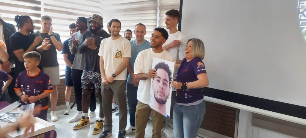 Tras las palabras del capitán llegó el momento de darle otra sorpresa más, una videollamada de sus padres, Chumilla y Conchi, los más fieles seguidores de los logros de su hijo y que no se pierden ni un solo partido juegue donde juegue el equipo morado.