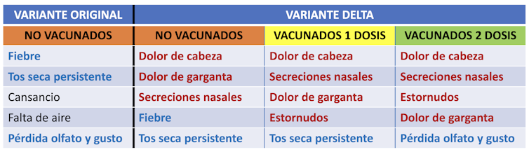 Los síntomas clásicos están tomados de documentos oficiales de la OMS, los síntomas de la variante delta están tomados del proyecto Zoe británico.