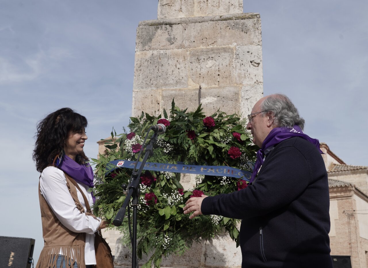 El foco de atención se desplazó a la plaza de España donde ante el monolito se realizaron las cuatro ofrendas florales a los principales líderes de la revuelta comunera -Juan de Padilla, Francisco Maldonado, Juan Bravo y María Pacheco-. Precisamente, esta última figura fue revindicada por la ministra de Igualdad, Ana Redondo, presidenta del PSCyL, mientras que el grupo Nuevo Mester de Juglaría, también participante en el acto, lanzó un mensaje de paz para el mundo y de unidad para Castilla y León.