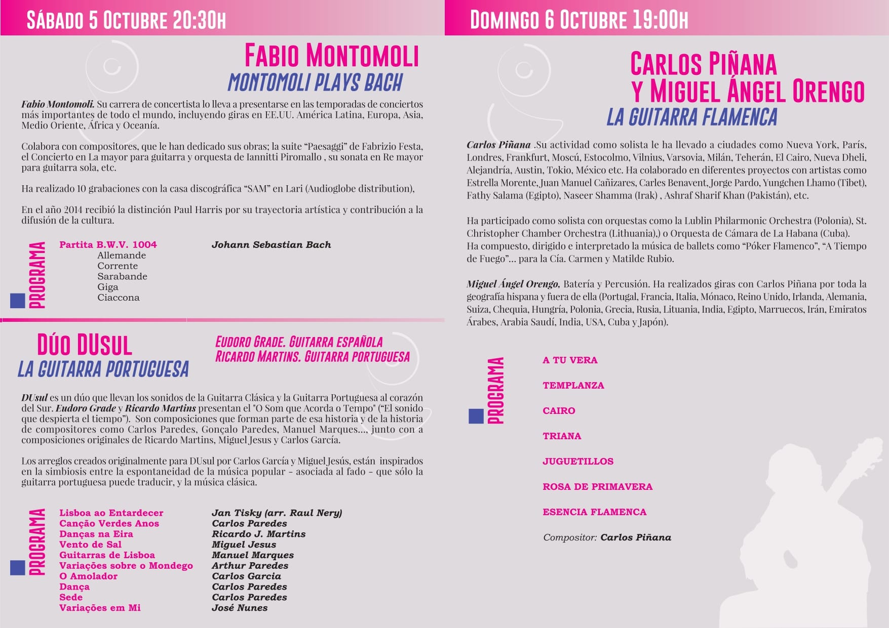 La inauguración del festival será el sábado 5 de octubre a las 20:30 horas con la tradicional Gala de la Guitarra. En este evento, el italiano Fabio Montomoli interpretará obras de J. S. Bach, con especial énfasis en su Chacona, una de las piezas más desafiantes para la guitarra. La primera jornada concluirá con la actuación del Dúo Dusul, de Portugal, compuesto por Eudoro Grade y Ricardo Martins, quienes presentarán un repertorio de fados adaptados a la guitarra.