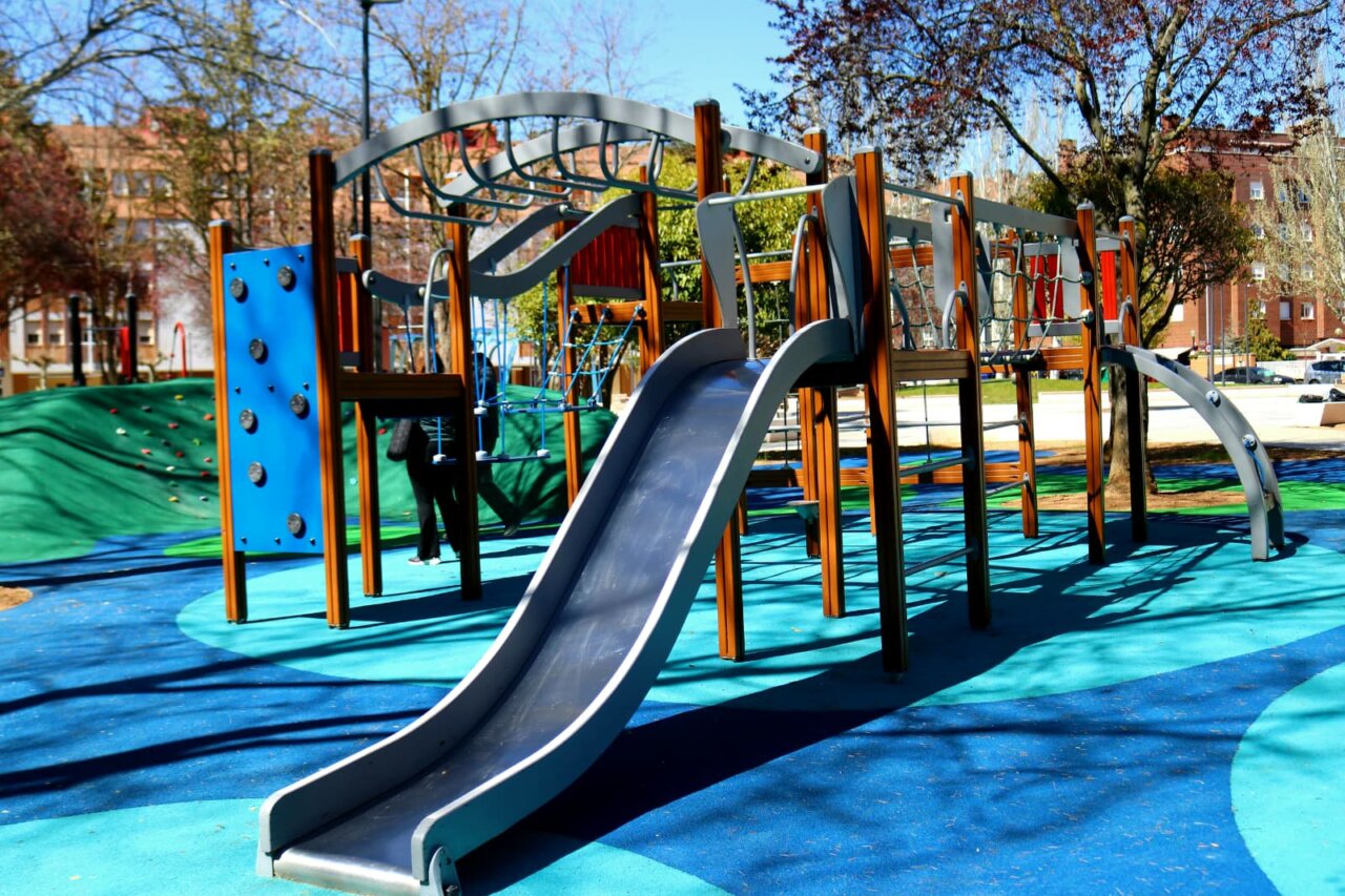 Niños jugando en un parque infantil renovado con estructuras modernas