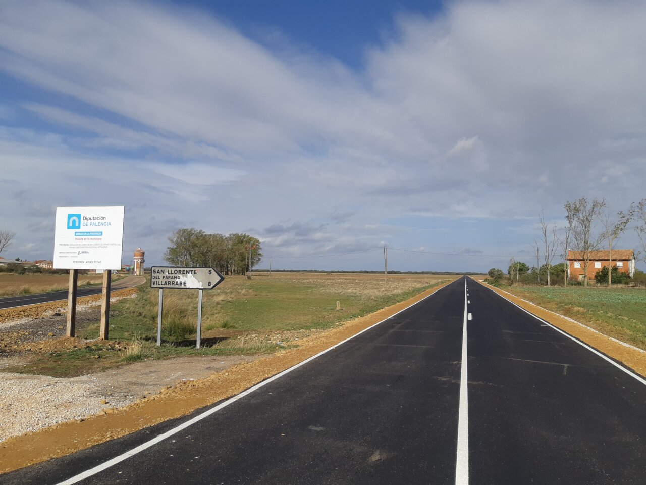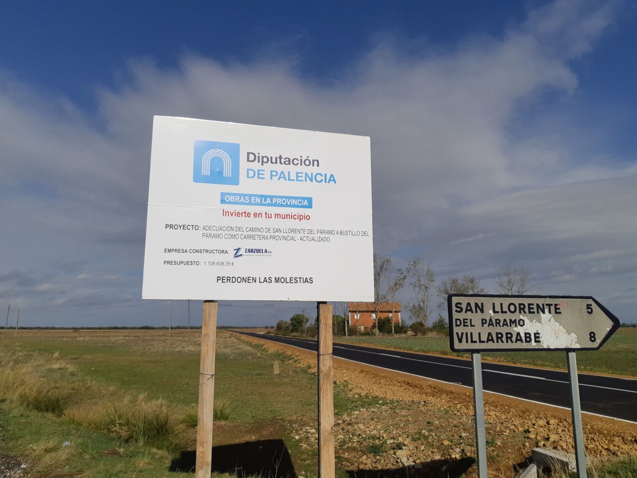 Cartel de obras de la Diputación de Palencia en un camino rural
