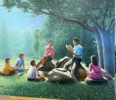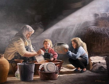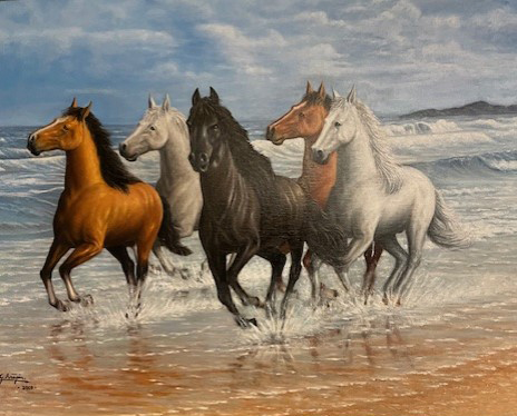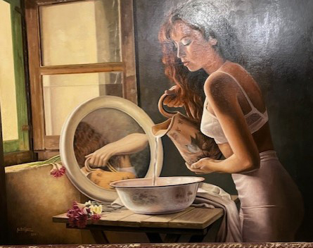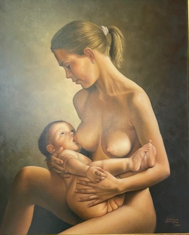 En definitiva, cada cuadro es una historia, técnica y plásticamente bien contada. Algunos merecen una referencia como ‘Marina con caballos’ (2009), una preciosa estampa ecuestre en una playa. El movimiento de los animales, el impacto de los cascos sobre el agua, las olas en segundo plano y las nubes en el horizonte celeste son los elementos que definen la belleza de este cuadro. La suave carnalidad de las figuras desnudas se fusiona con la ternura de la madre y el hijo en ‘Maternidad’ (2010). Otra maternidad es ‘Al cobijo de la madre’ (2007), donde una mujer lava en un bargueño platos y cazuelas en presencia de sus dos hijos. La frescura de la naturaleza se combina con la presencia de seis jóvenes en ‘Clase en el campo’ (2009), escena que se desarrolla con una esplendorosa luz natural, cualidad esta que también se manifiesta en ‘Regreso al atardecer’ (2007), donde un pastor cruza el bosque entre los brillantes rayos que superan el frondoso paisaje de árboles.