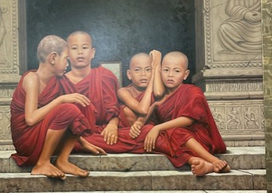 Con una técnica depurada y una pincelada minuciosa, el pintor ha creado cuadros de una factura excelente e impecable, como ‘Monjes budistas’, una retrato de cuatro niños sentados en las escaleras de un edificio de trazas clásicas con una prevalencia del color rojo de los hábitos y la carnalidad de la piel, captados con rostro de sorpresa. ‘Qué tendrá el dinero’ es otro cuadro a destacar por el realismo con que ha pintado los billetes que brotan de un cofre ante el gesto entusiasta de un hombre que los descubre.