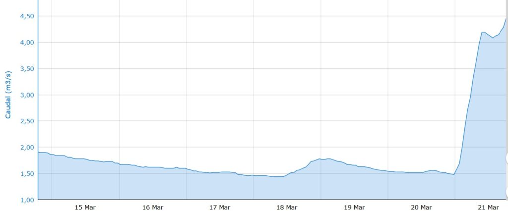 El incremento del agua que transporta es consecuencia directa de las precipitaciones de las últimas horas que llegaron a superar los 20 litros por metro cuadrado en toda la cuenca de recogida durante la pasada madrugada. En lo que va de mes, se han registrado cerca de 80 litros por metro cuadrado.