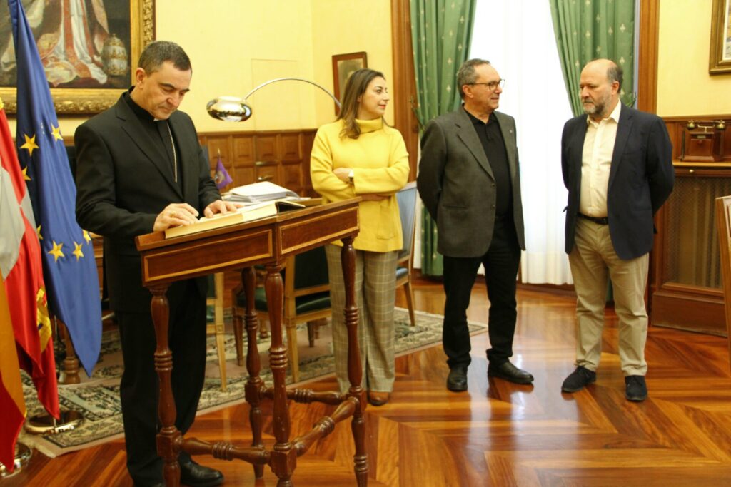 En la que ha sido su primera visita al Ayuntamiento de Palencia, el Obispo ha tenido la oportunidad de saludar y mantener una charla con alguno de los concejales que conforman el equipo de Gobierno en el Ayuntamiento para, a continuación, firmar en el libro de honor del Consistorio capitalino donde ha dejado plasmadas estas palabras: “Con sentimientos de gratitud por la maravillosa acogida dispensada por la ciudad de Palencia, ya mi querida ciudad, firmo en este libro con el anhelo de servir a todos, y de llevar la alegría de Jesús, el Señor a todos. Mis mejores deseos y mi bendición”.