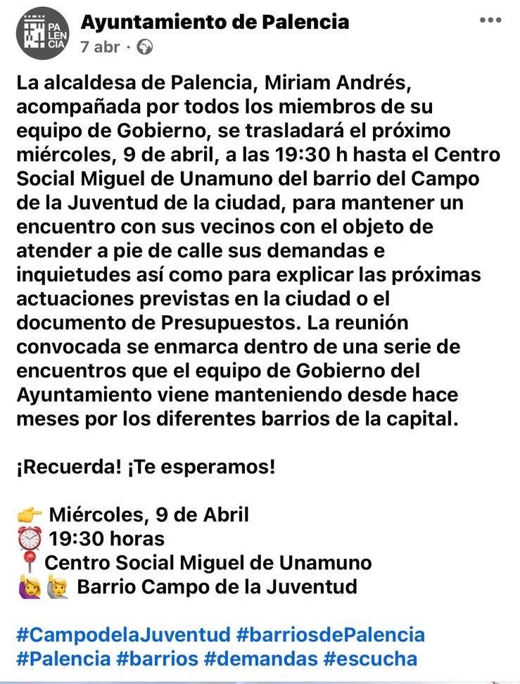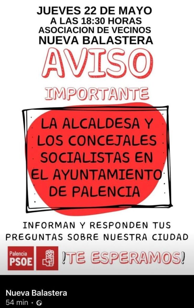 La denuncia se centra especialmente en las visitas que el equipo de Gobierno realiza a diversos barrios de la ciudad, como Campo de la Juventud o la Nueva Balastera. Estas reuniones, organizadas por el propio Ayuntamiento con el objetivo de conocer las necesidades vecinales, son anunciadas a través de las redes sociales municipales. No obstante, el PP señala que también se están difundiendo mediante publicidad buzoneada con el logotipo del PSOE, en la que se puede leer: “la alcaldesa y los concejales socialistas en el Ayuntamiento de Palencia informan y responden tus preguntas sobre nuestra ciudad”.