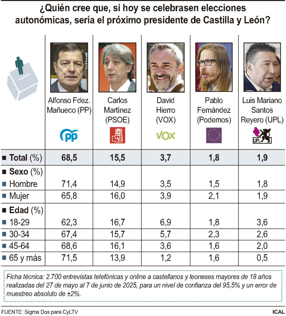 Por otra parte, el 68,5 por ciento de los encuestados considera que el actual presidente del PP y de la Junta de Castilla y León, Alfonso Fernández Mañueco, repetirá en el cargo tras unas nuevas elecciones autonómicas. La percepción es mayoritaria por perfiles de edad y sexo y también en lo referido al recuerdo de voto. Así lo estiman el 89,1 por ciento del electorado del PP y el 70 por ciento de los votantes de Vox. Esta impresión supera el 59 por ciento, también entre el electorado del PSOE (59,3 por ciento) y de Podemos (59,2 por ciento).