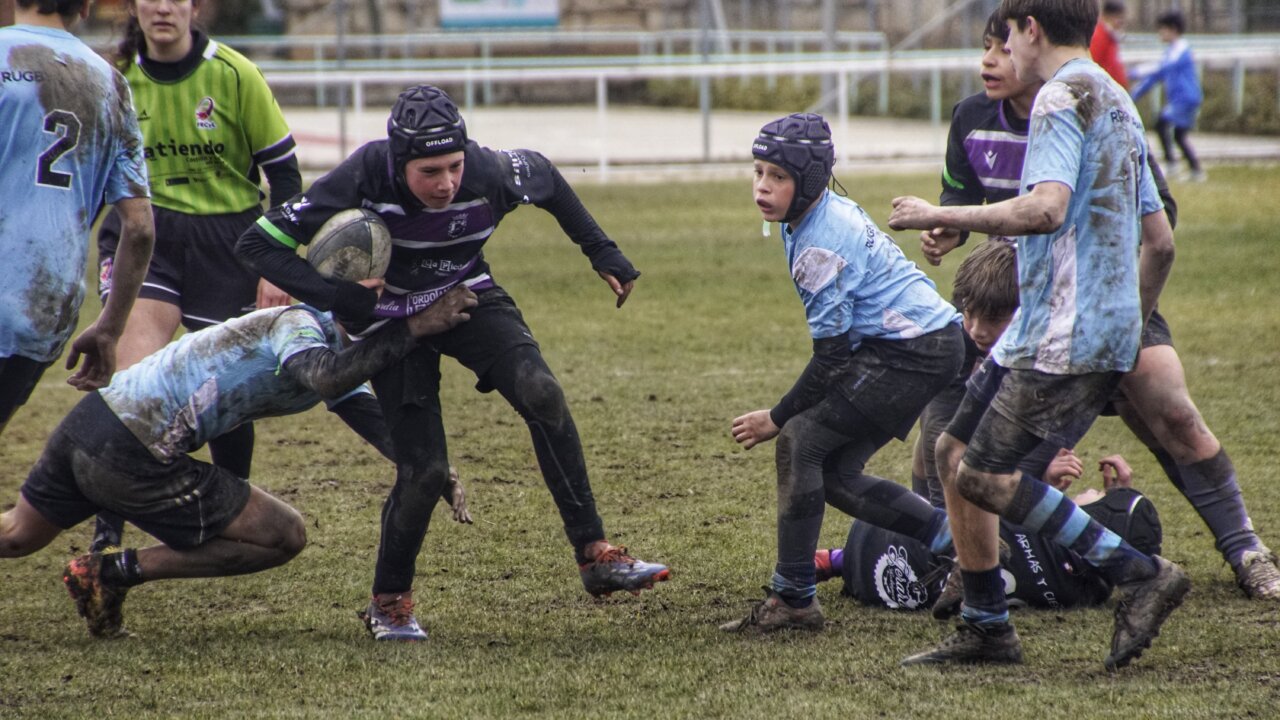 Jugador sub-14 de rugby evadiendo un placaje en un partido en Aranda de Duero