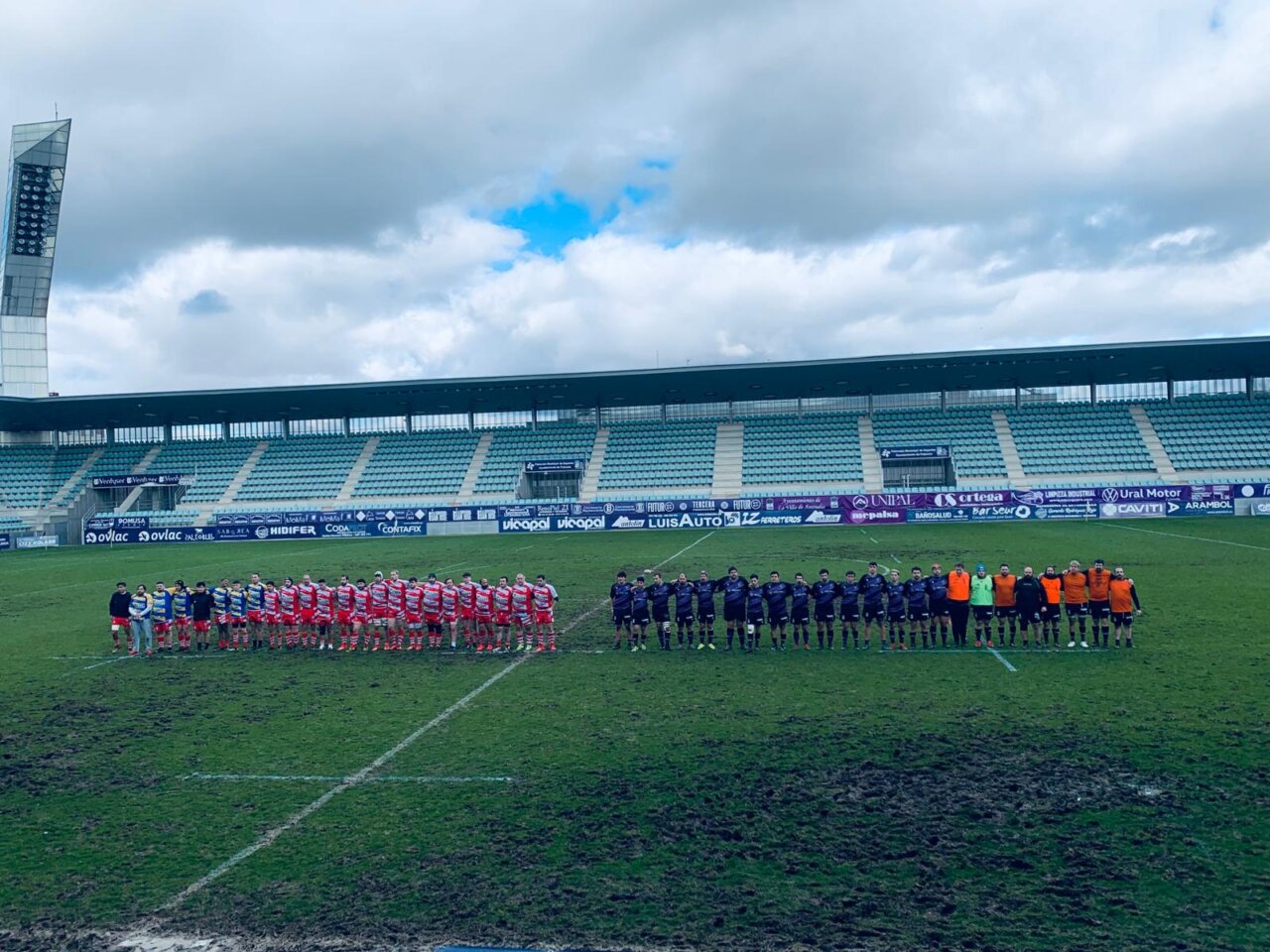 Equipos de rugby alineados en el campo antes del partido en Palencia.