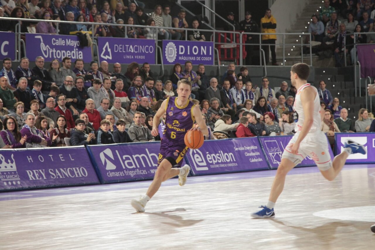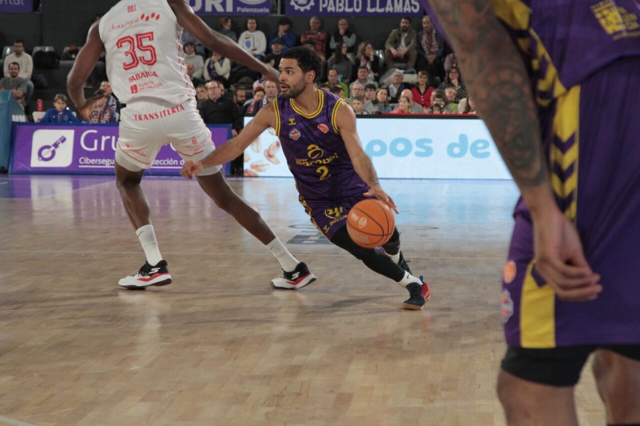 Jugador del Súper Agropal Palencia driblando el balón en un partido de baloncesto
