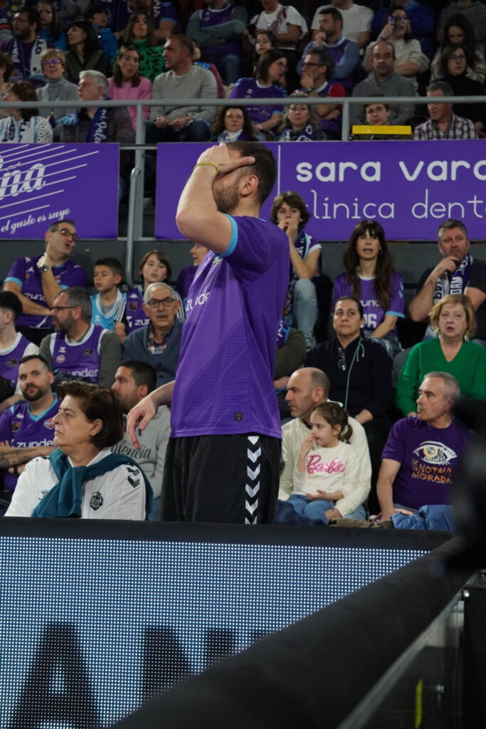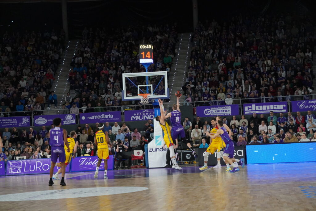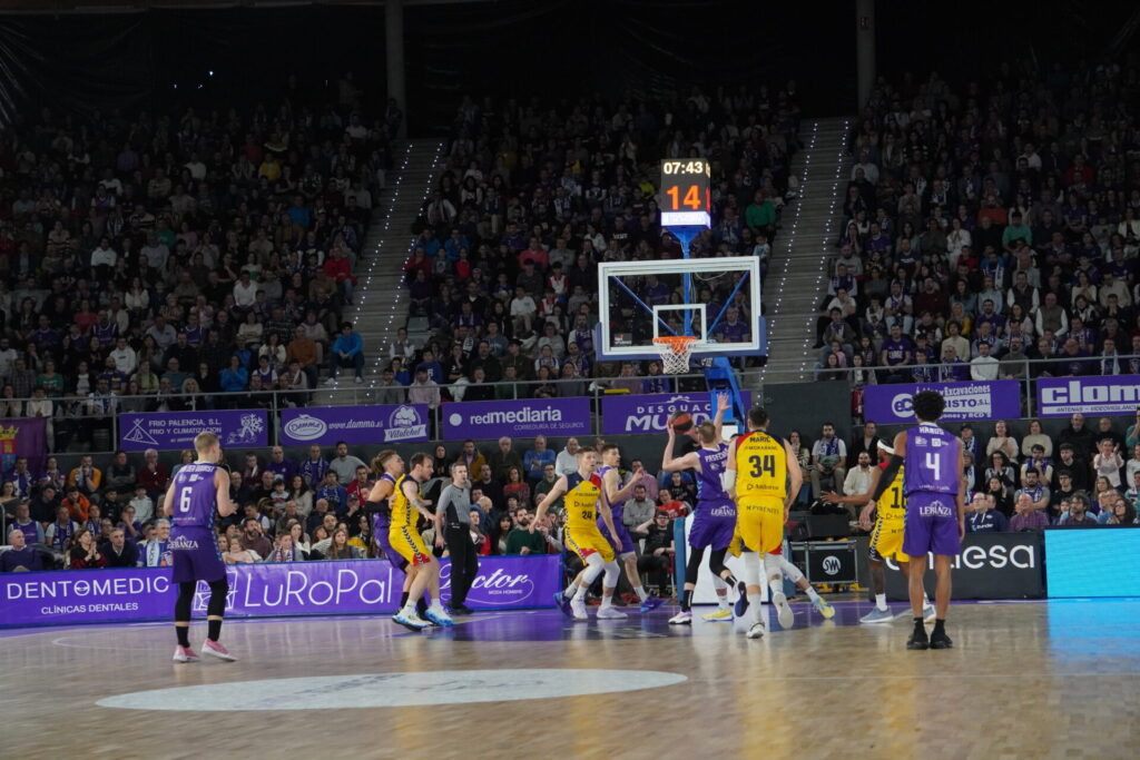 Seis minutos y ventaja local de 14. Pero esta se redujo en un minuto a sólo 10. De nuevo atasco en ataque de los palentinos, con malos tiros. Pero el tiempo pasaba y los morados, aún sufriendo, mantenían la renta. 10 puntos a falta de 3,15.