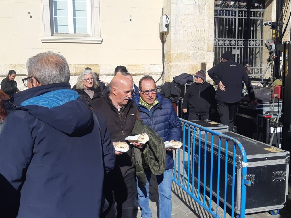 Una fila que, cierto es, difiere en velocidad de la que exisitió, con origeen también en la Plaza Mayor, hace menos de un mes. En la del Roscón de Reyes. La de hoy era más lenta por motivos logísticos. Si en Navidades están buena parte de los 25 concejales para el reparto, hoy no había ediles y el equipo de El Maño tenía que elaborar a la plancha, embocatar y distribuir el producto en el momento. Porque la panceta fría no sabe igual. Suerte que la mañana era agradable, el sol brillaba, así que, de este cerdo también se pudo aprovechar la cola.
