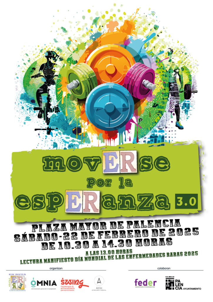 Otra de las propuestas llevará el día 22 de febrero a cientos de personas a la Plaza Mayor de la capital, donde se celebrará una jornada deportiva a favor de la investigación de las enfermedades raras. ‘MovERse por la espERanza’ -que tendrá lugar de 10:30 a 14:30 horas está organizada por ‘En Ruta por las Enfermedades Raras’, Omnia Centro de Entrenamiento Personal y Readaptación, Swing Fisioterapia y Entrenamiento Personal y Alkai Entrenamiento Personal, además de contar con la colaboración de FEDER y el Ayuntamiento de Palencia.
