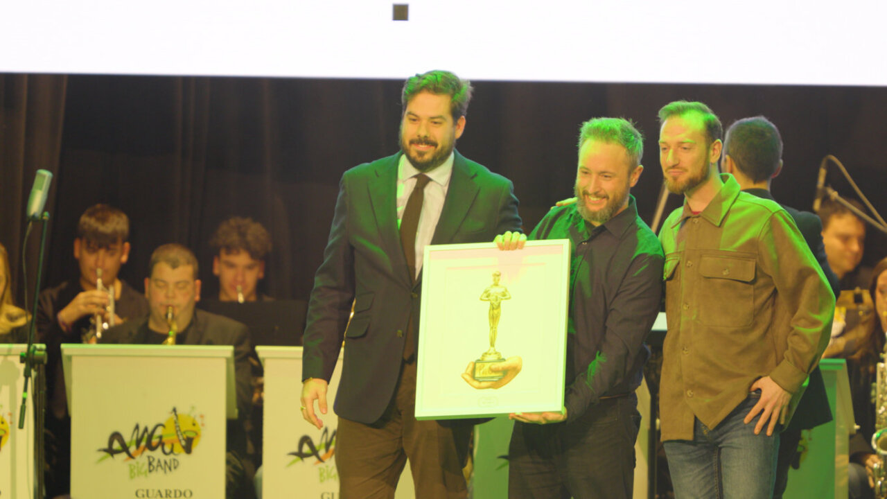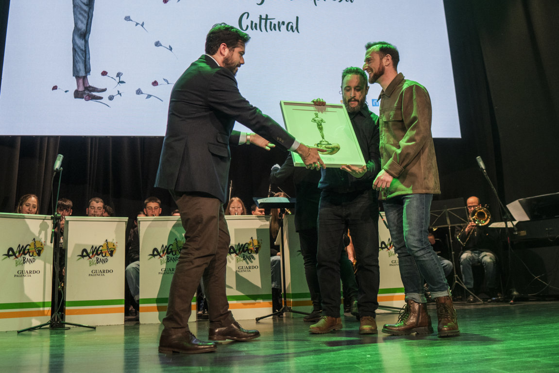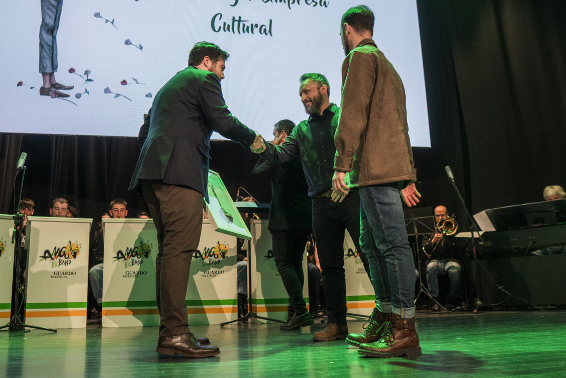 Dos hombres sosteniendo un premio en el escenario durante la gala de cultura en Guardo.