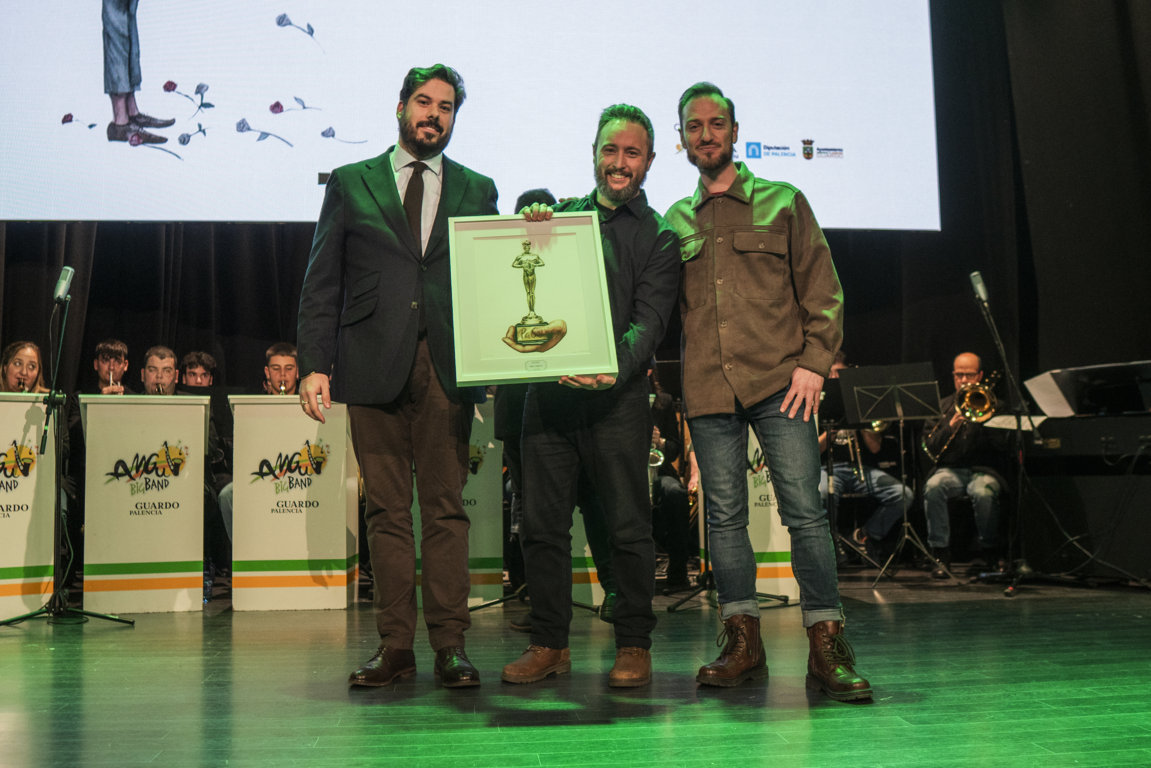 Tres personas en el escenario sosteniendo un premio durante la gala de los Premios PaCO en Guardo.