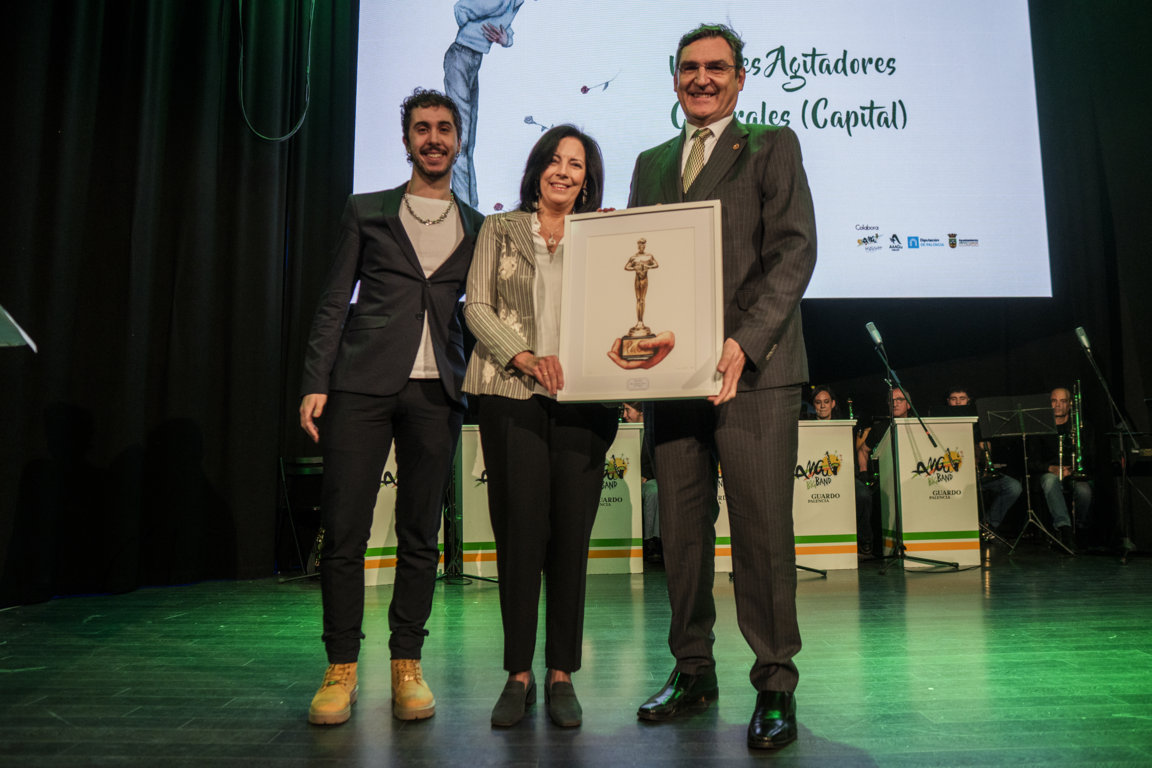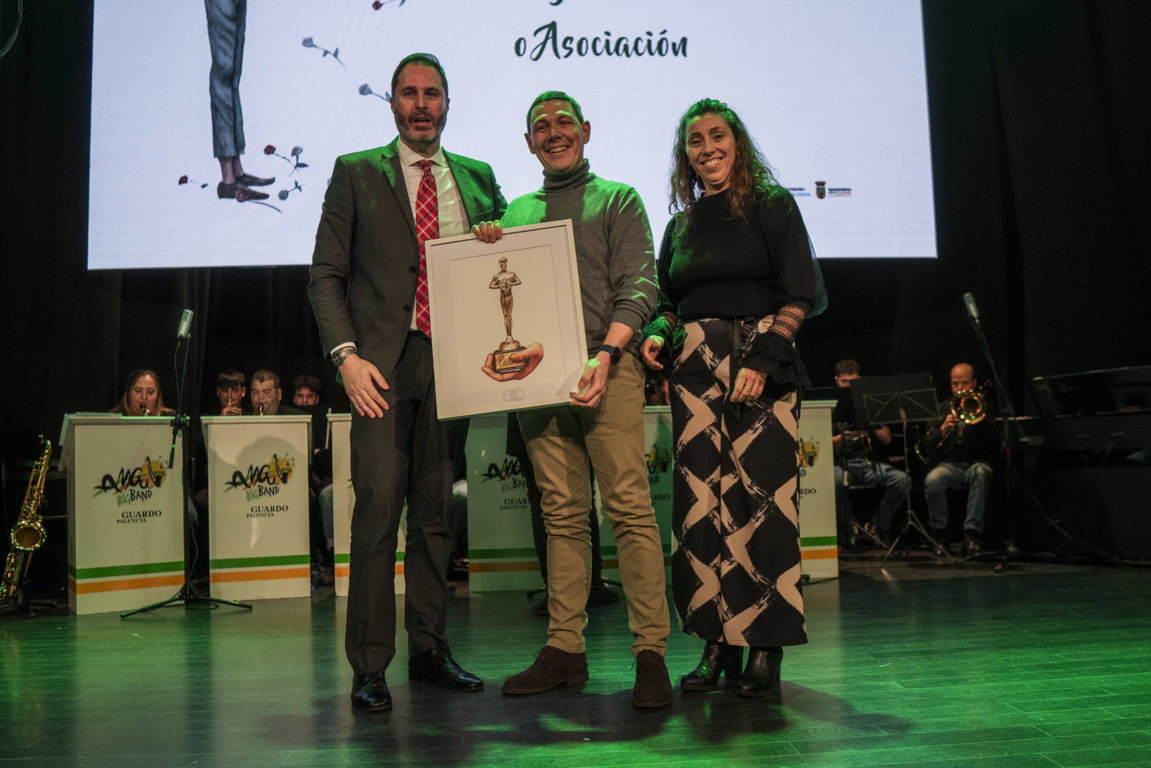 Tres personas sosteniendo un premio en la gala de los Premios PaCO en Guardo.