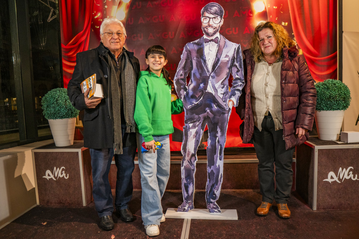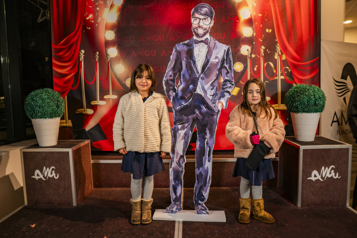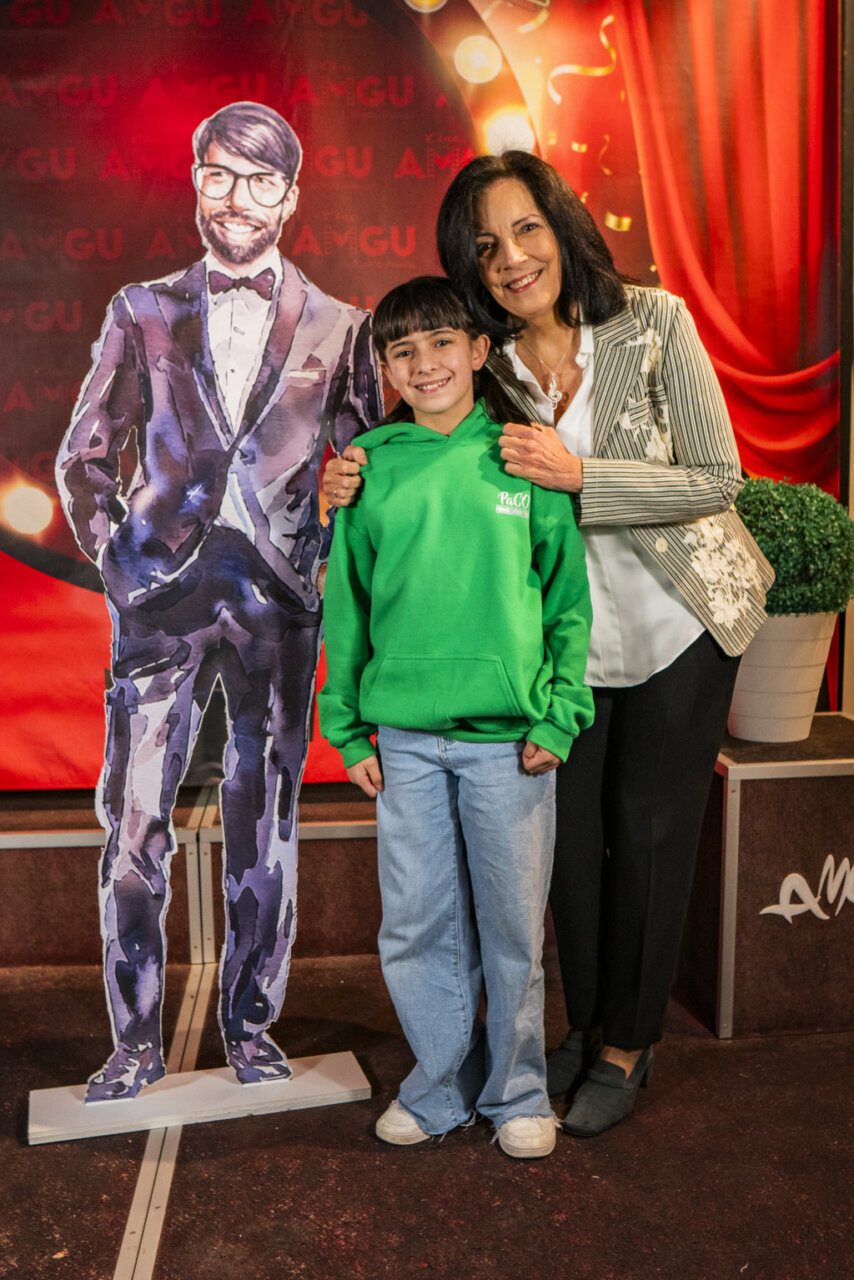 Niño posando junto a un cartel de cartón en un photocall de gala.