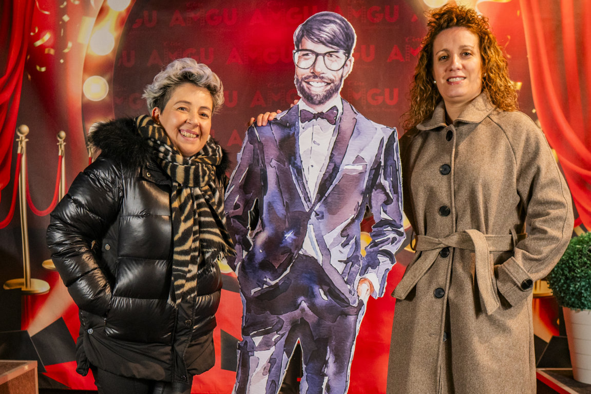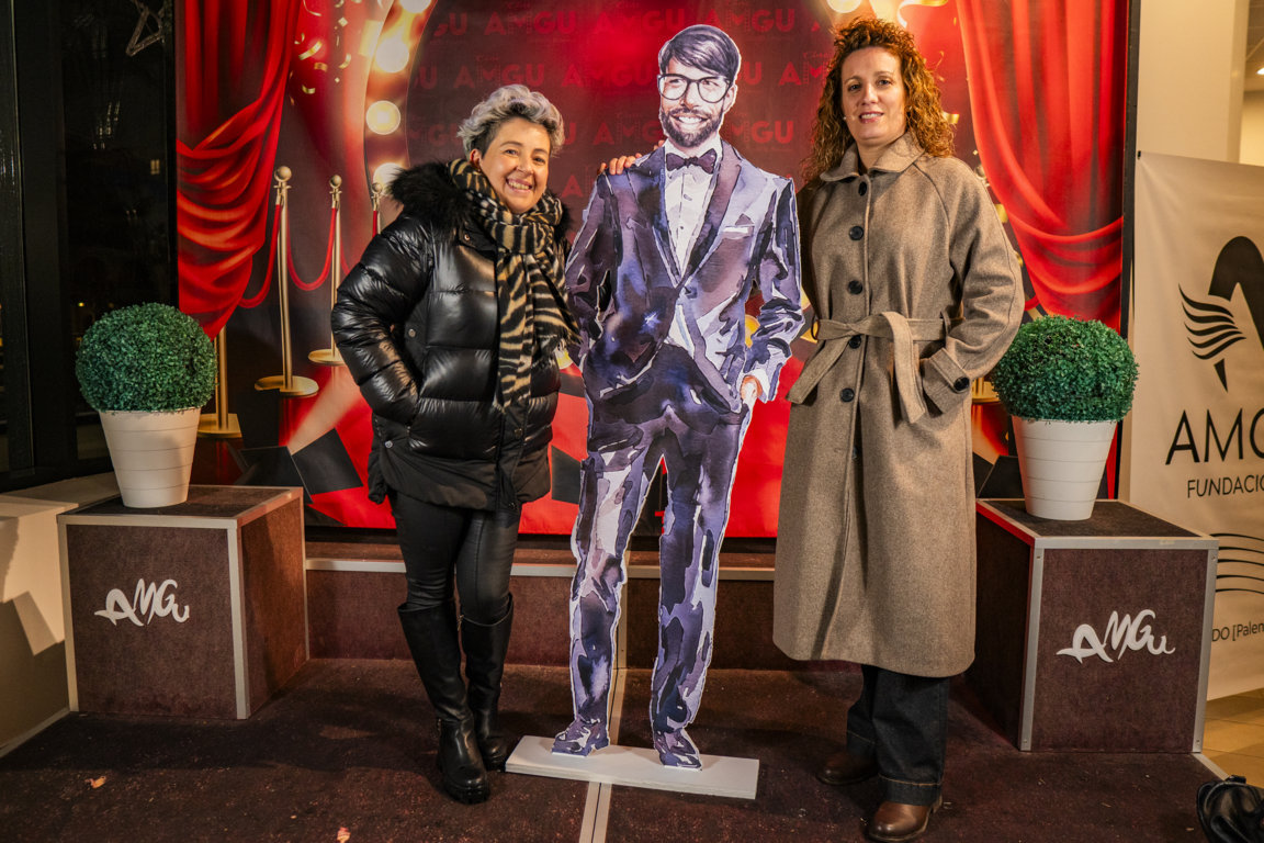 Dos mujeres posando junto a un cartel de un hombre en un photocall.