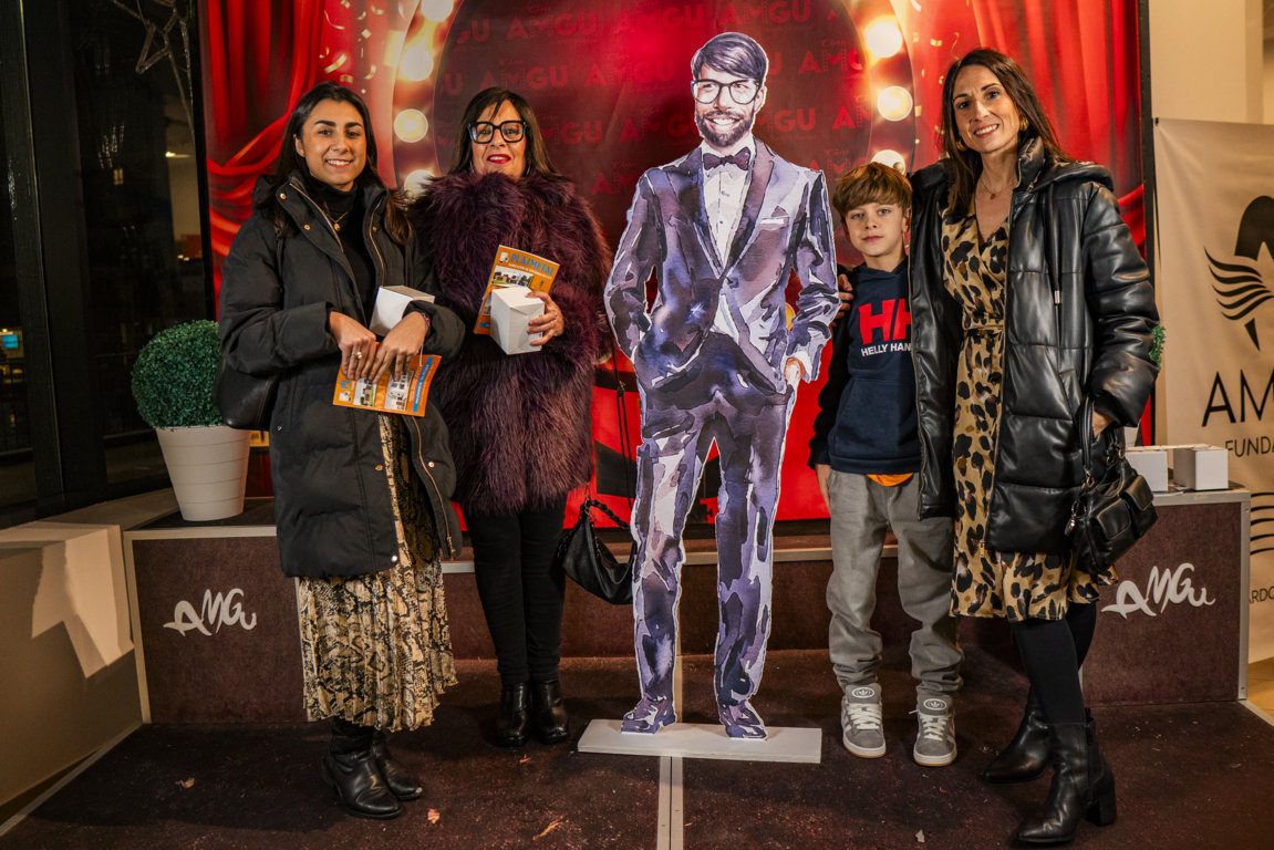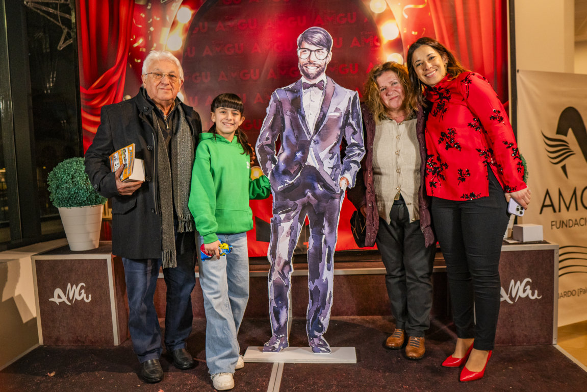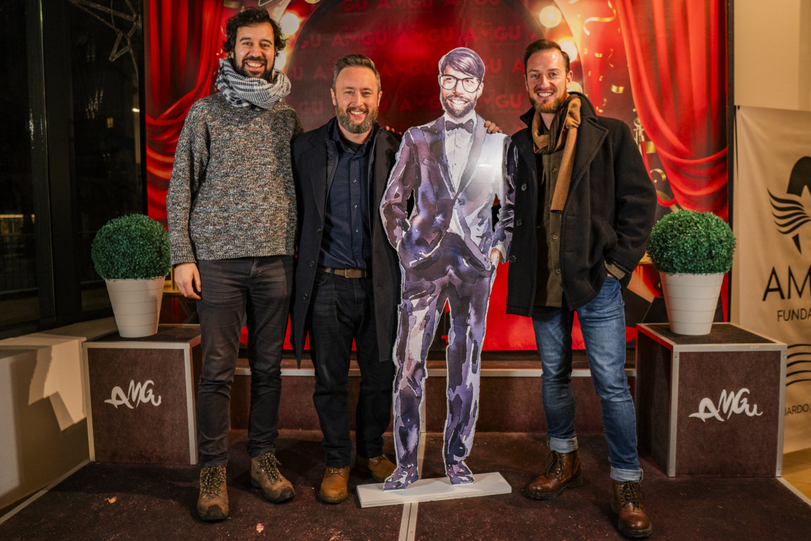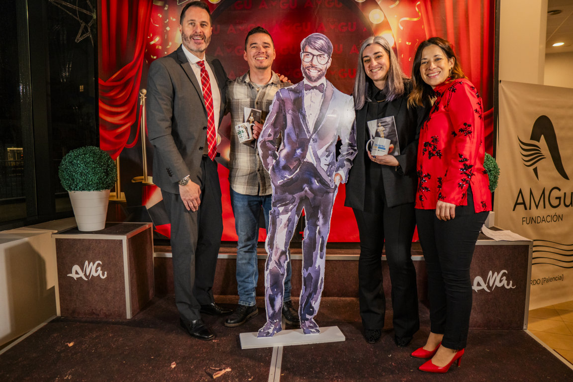 Fotografía de un photocall con cuatro personas posando junto a un cartel de cartón.
