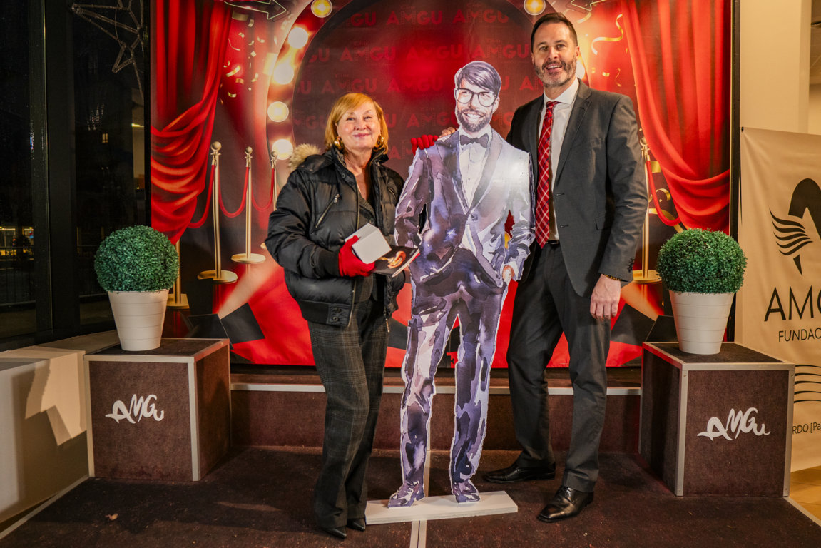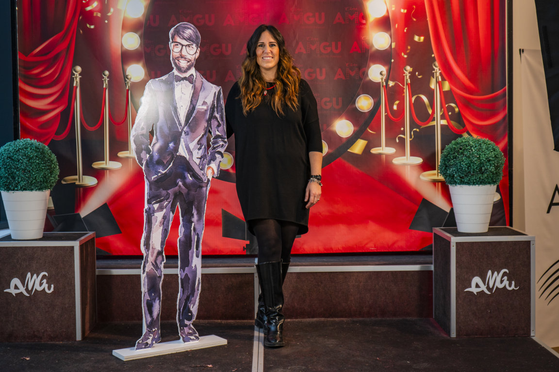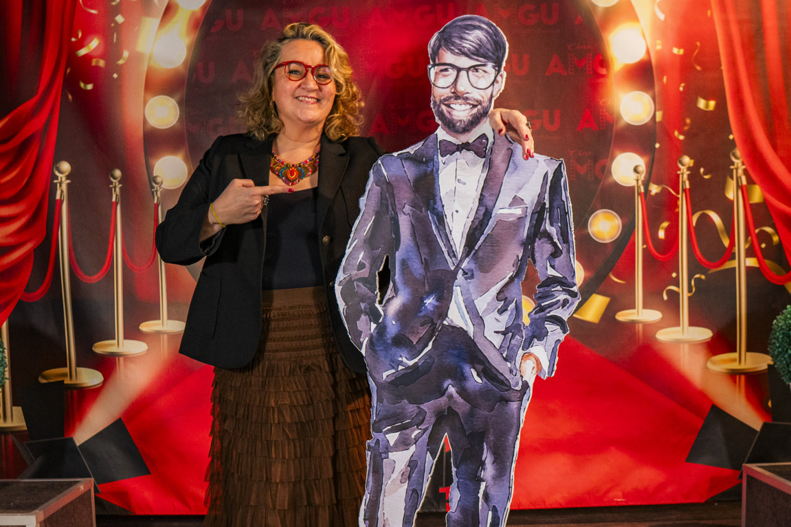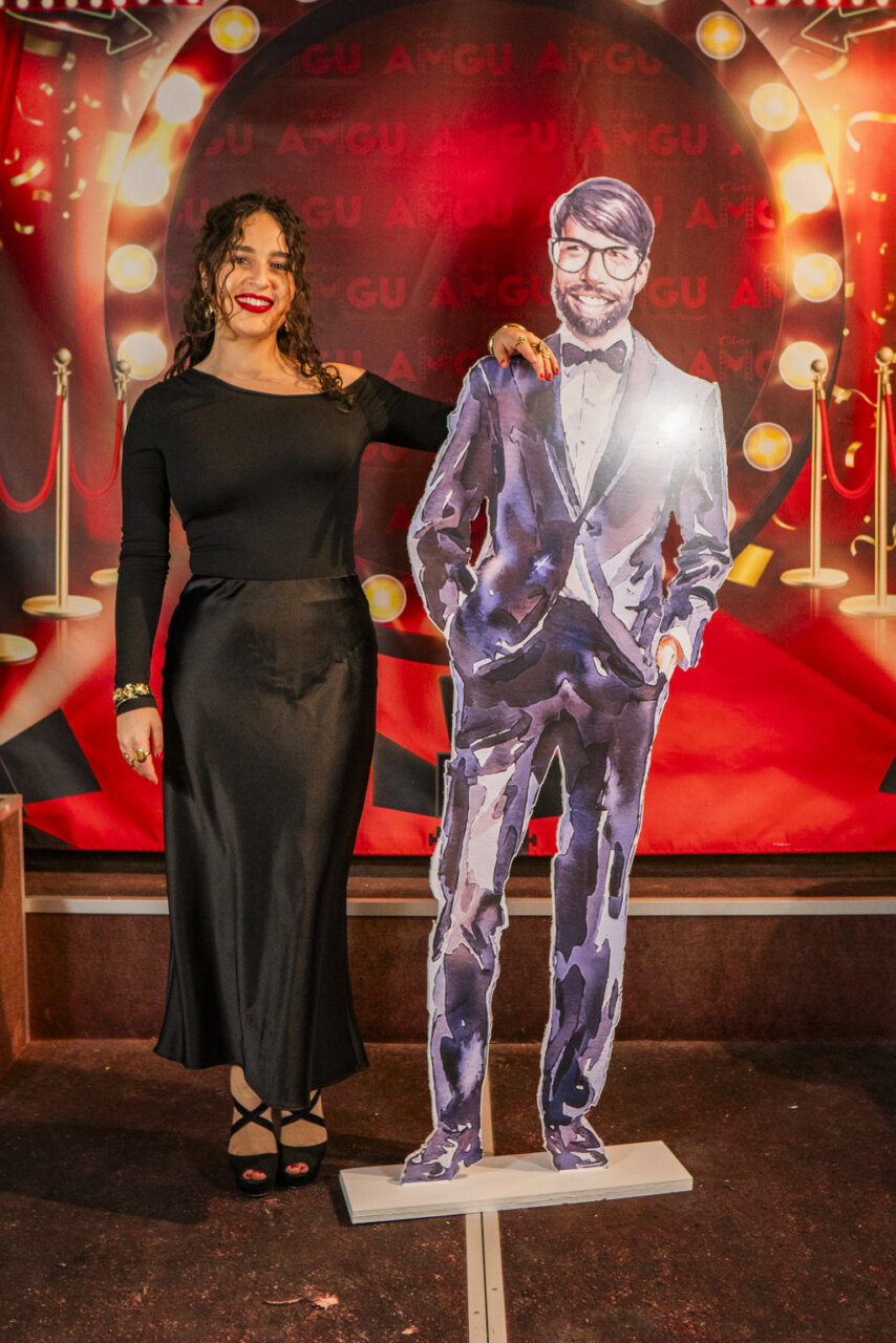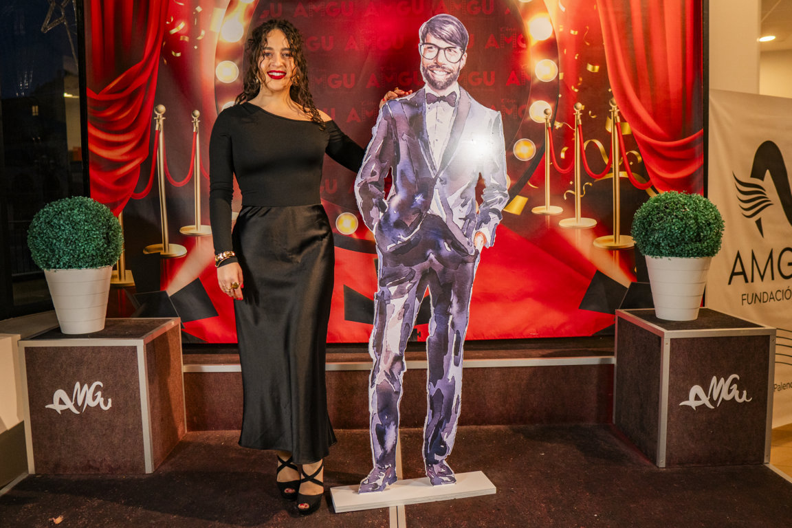 Mujer posando en un photocall con figura de cartón de un hombre vestido de gala.