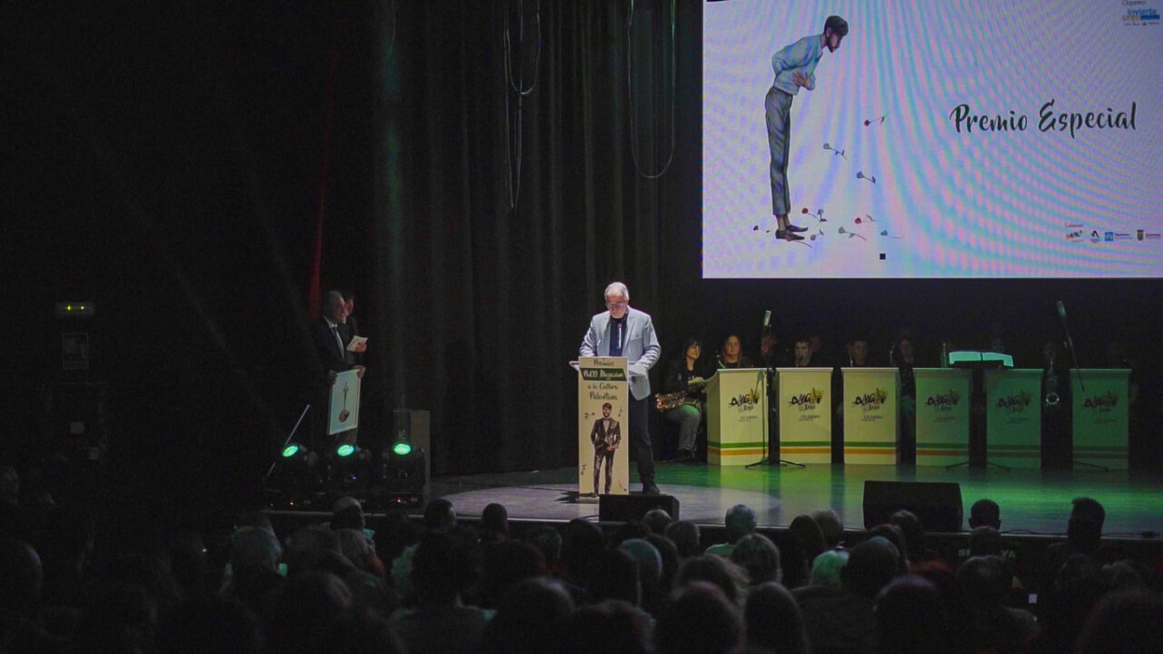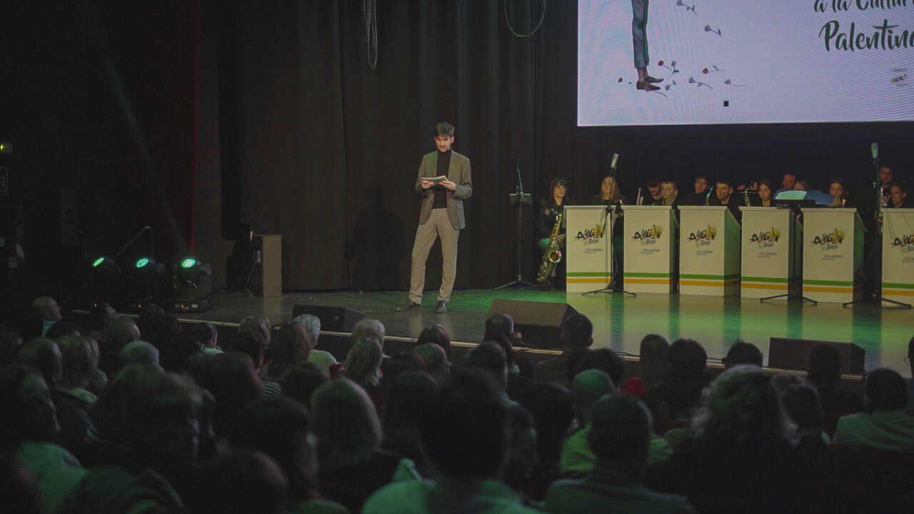 Presentador en la gran gala de la cultura palentina con público al fondo