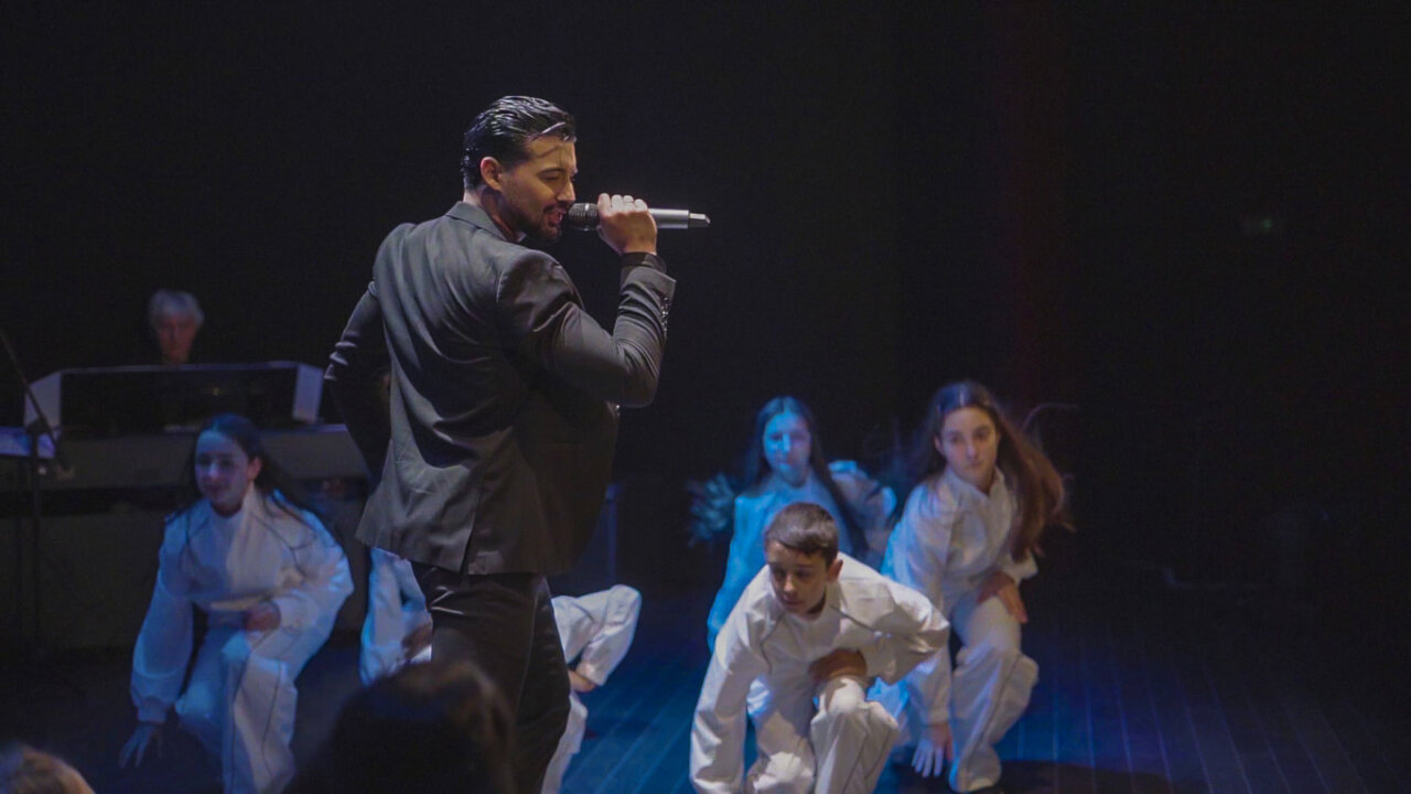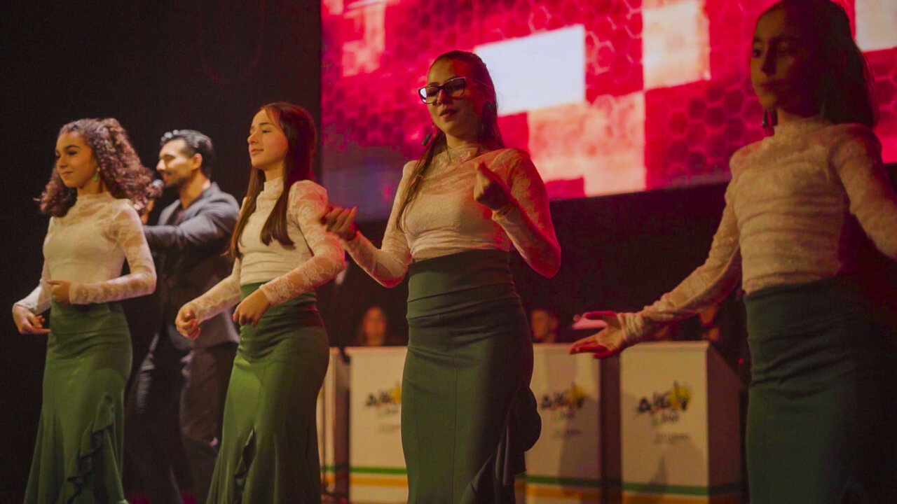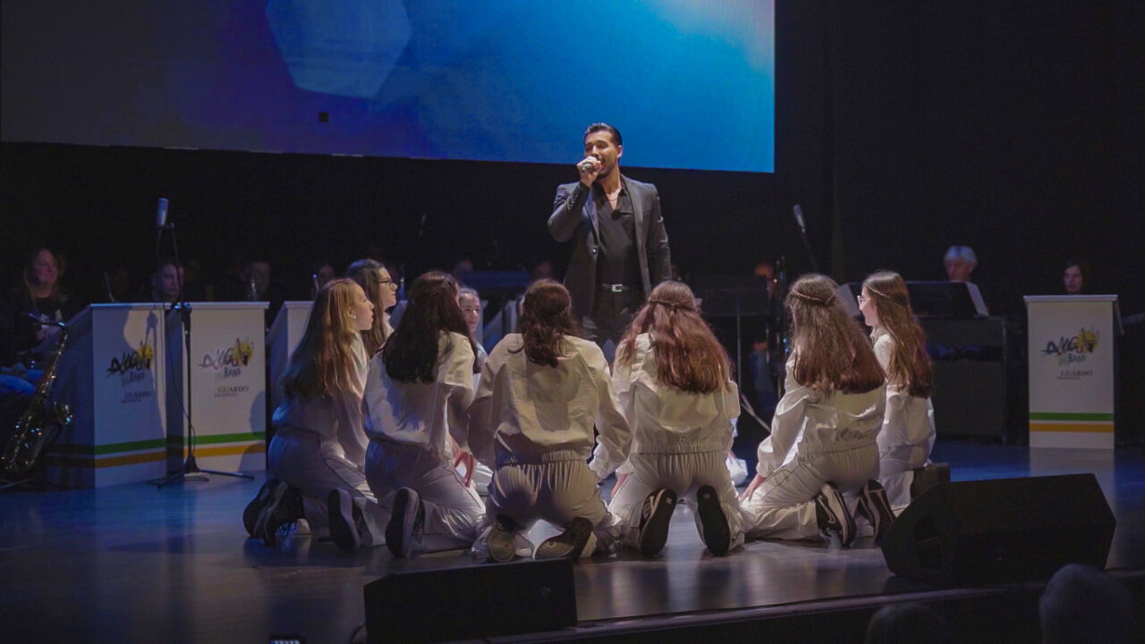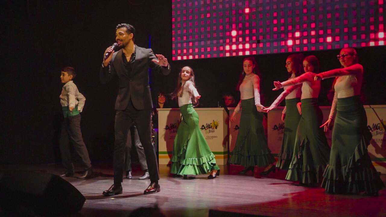 Artista cantando en la gran gala de la cultura palentina con bailarines
