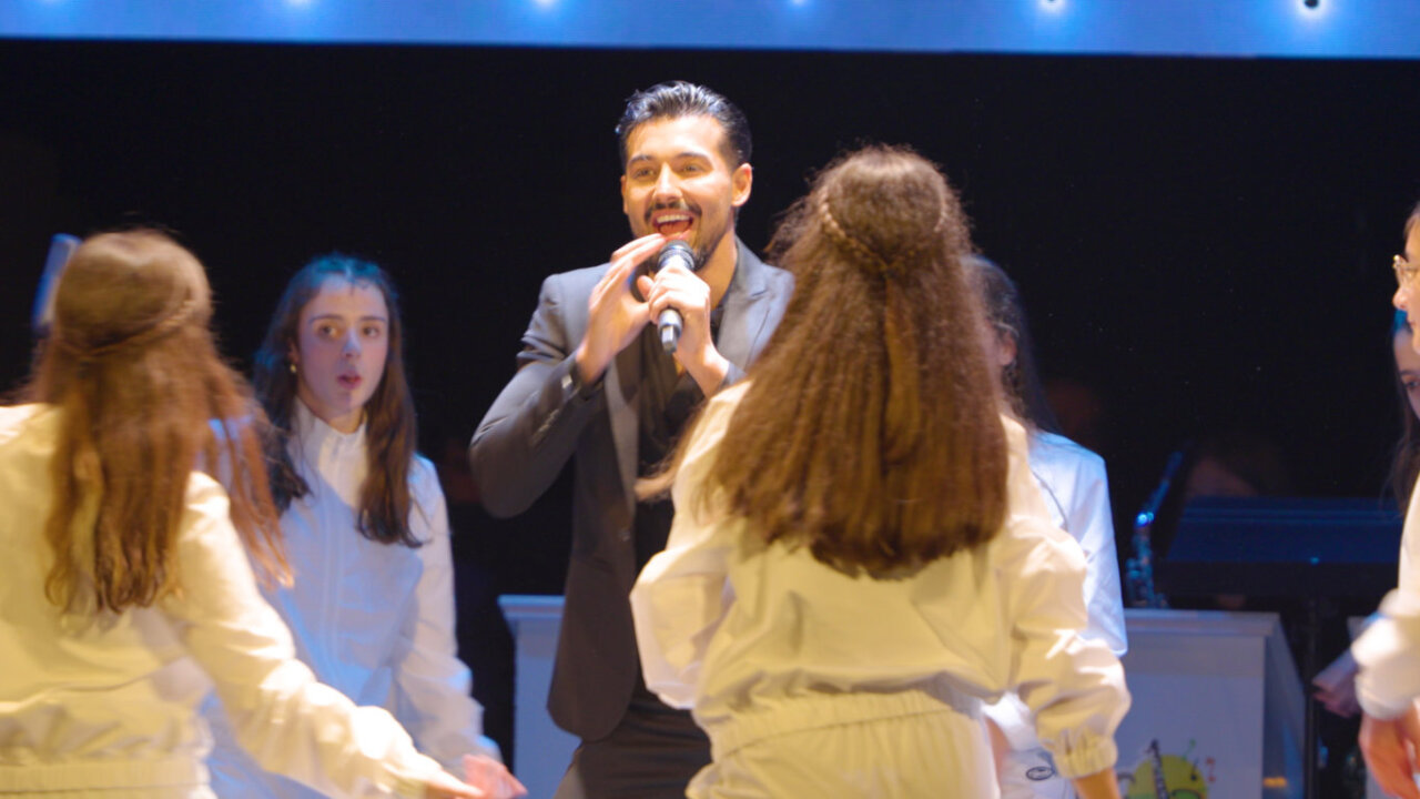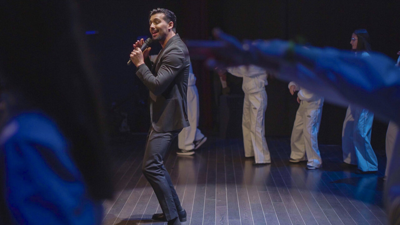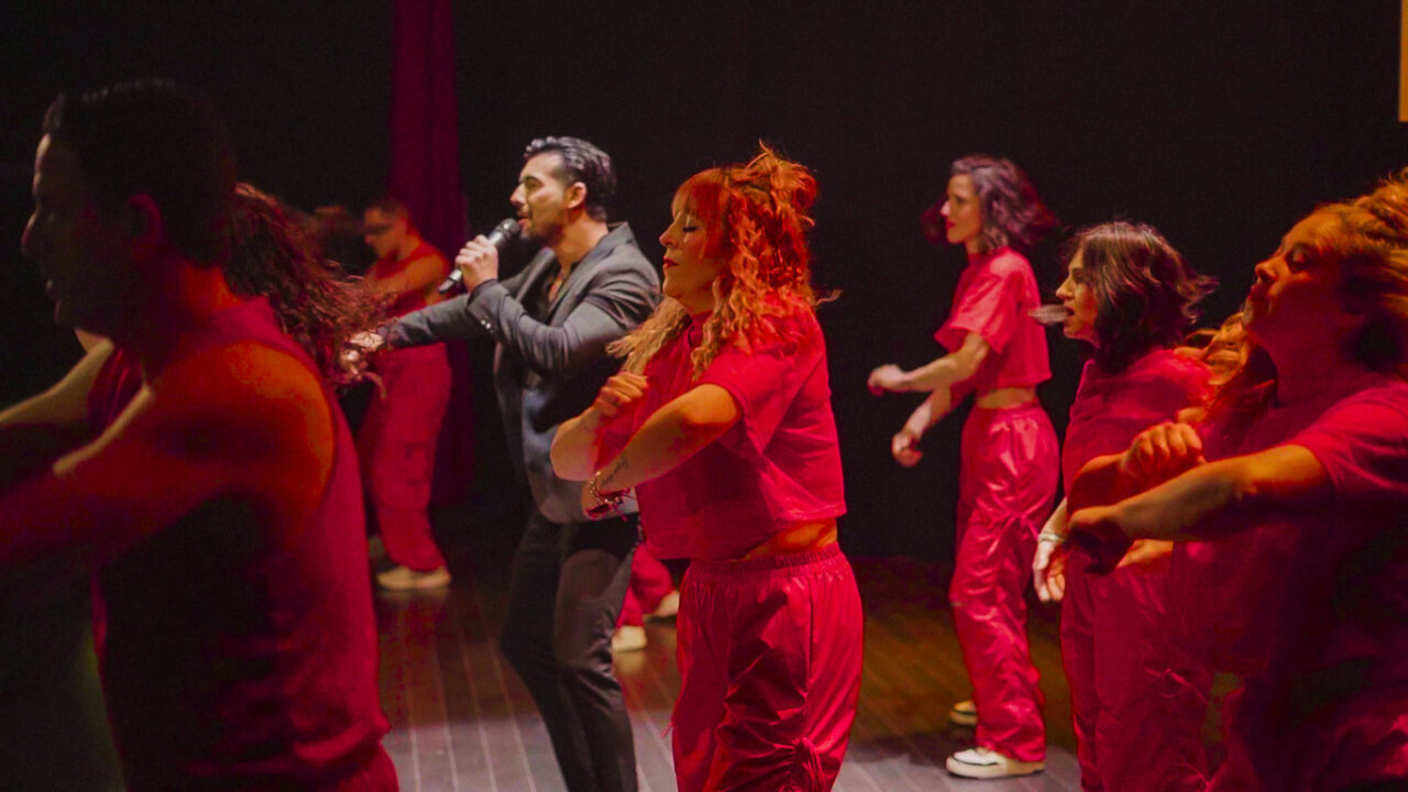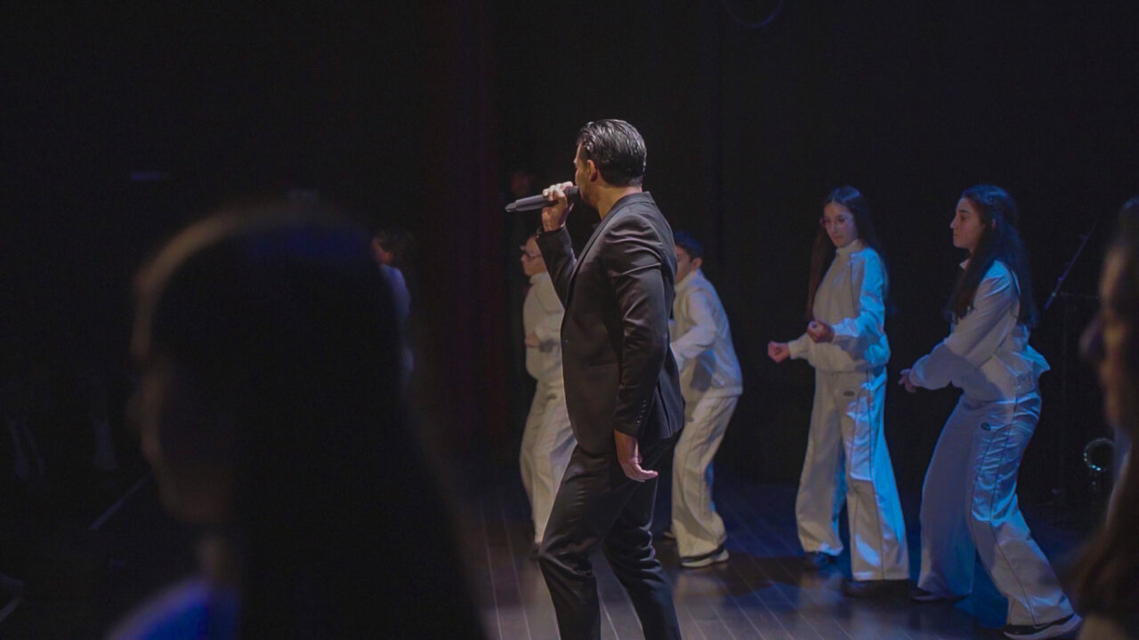 Artista cantando en la gran gala de la cultura palentina con bailarines