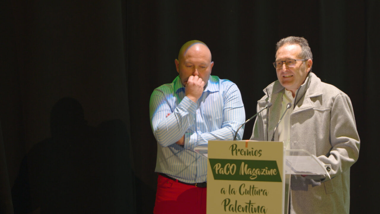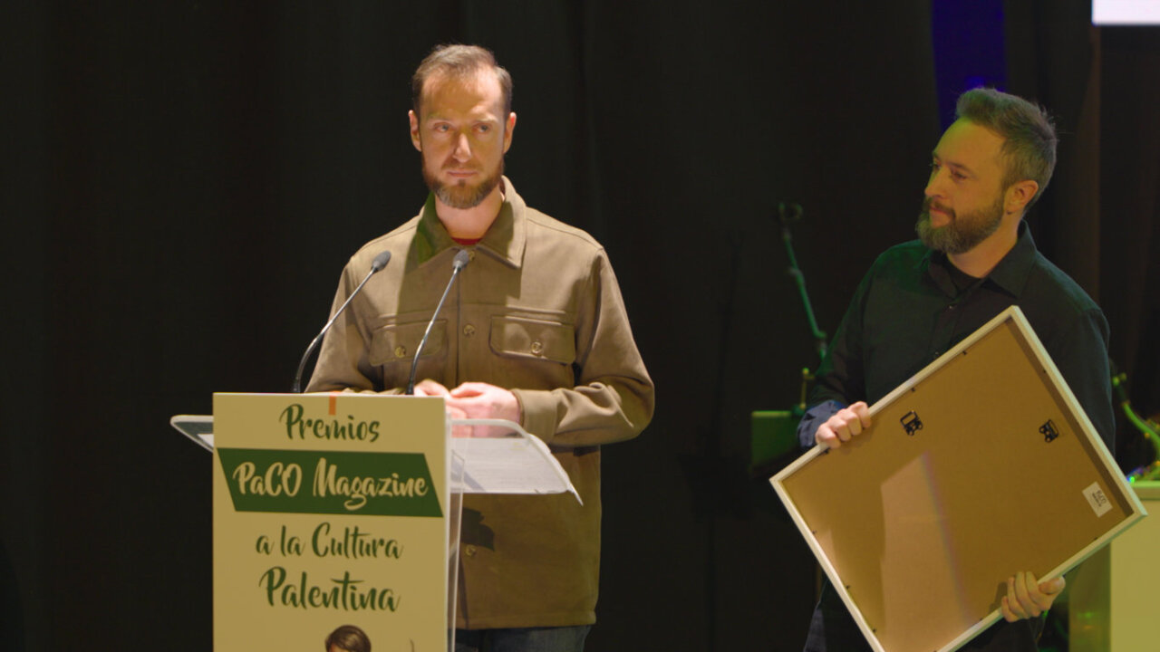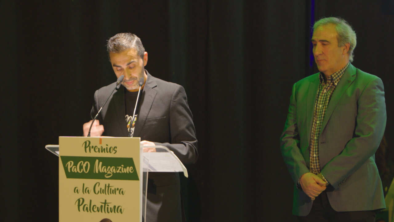 Dos hombres en el escenario durante la gala de los Premios PaCO en Guardo.