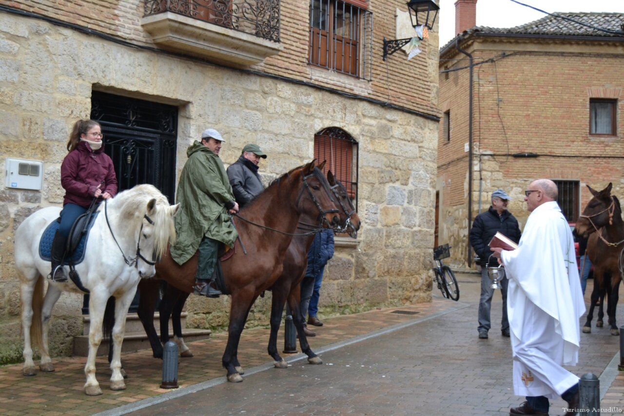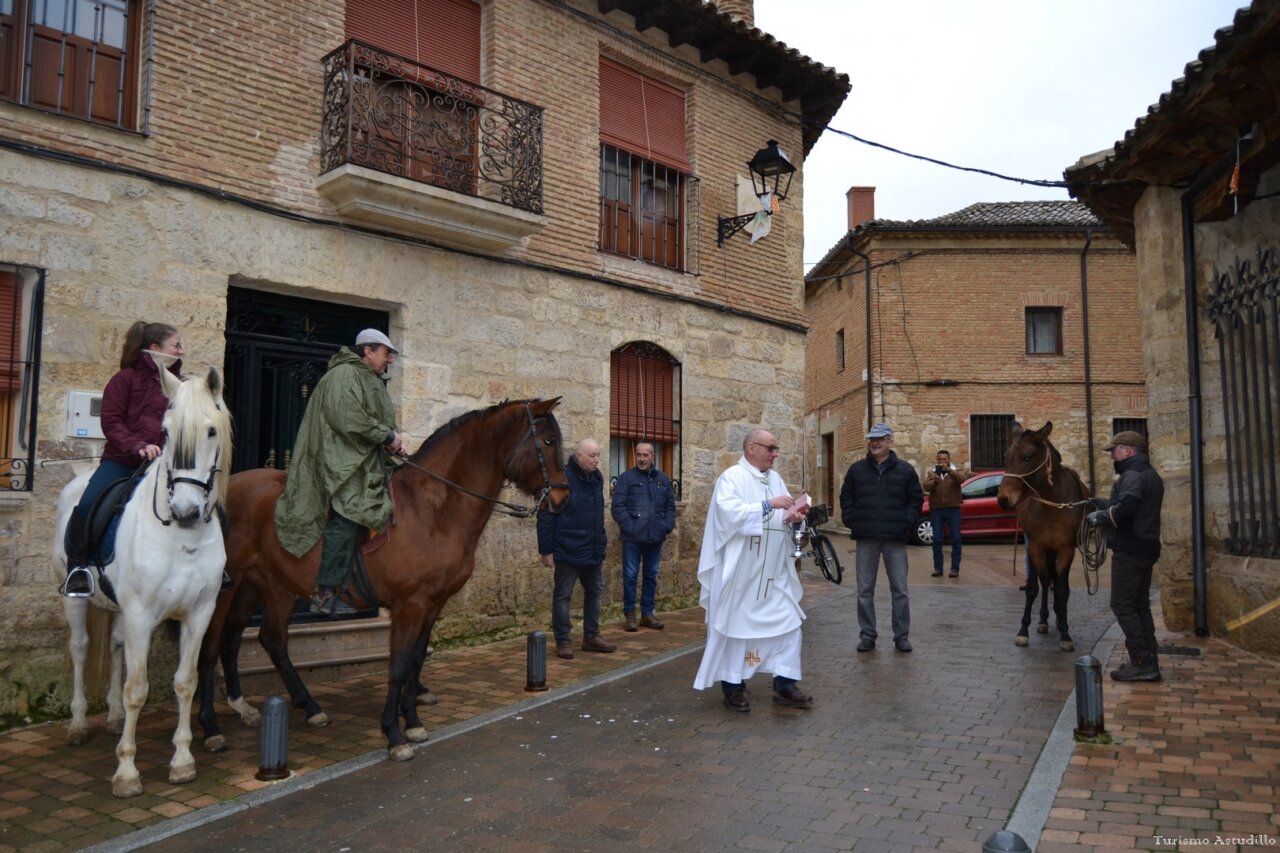 Celebración de la bendición de animales en Astudillo con jinetes y un sacerdote.