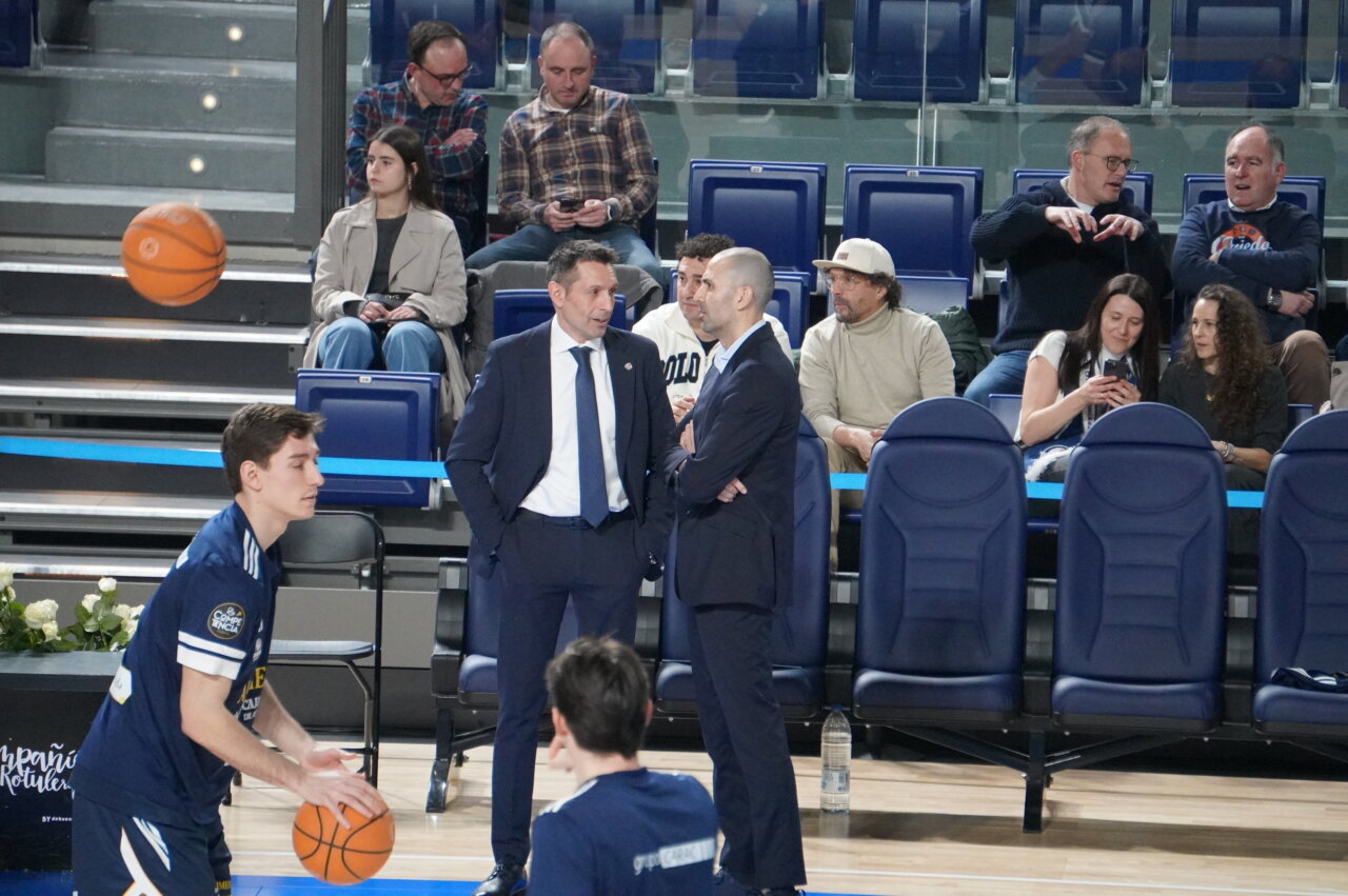 Entrenadores conversando durante un partido de baloncesto en Palencia.