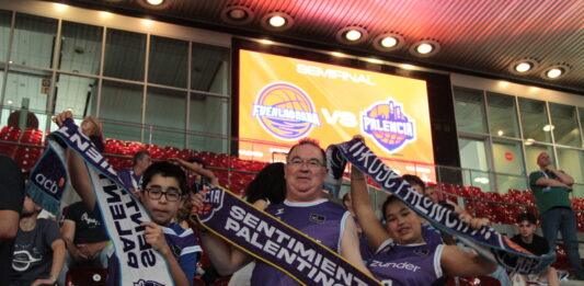 Así recibe la afición palentina a su equipo en la Caja Mágica, más morada que nunca.